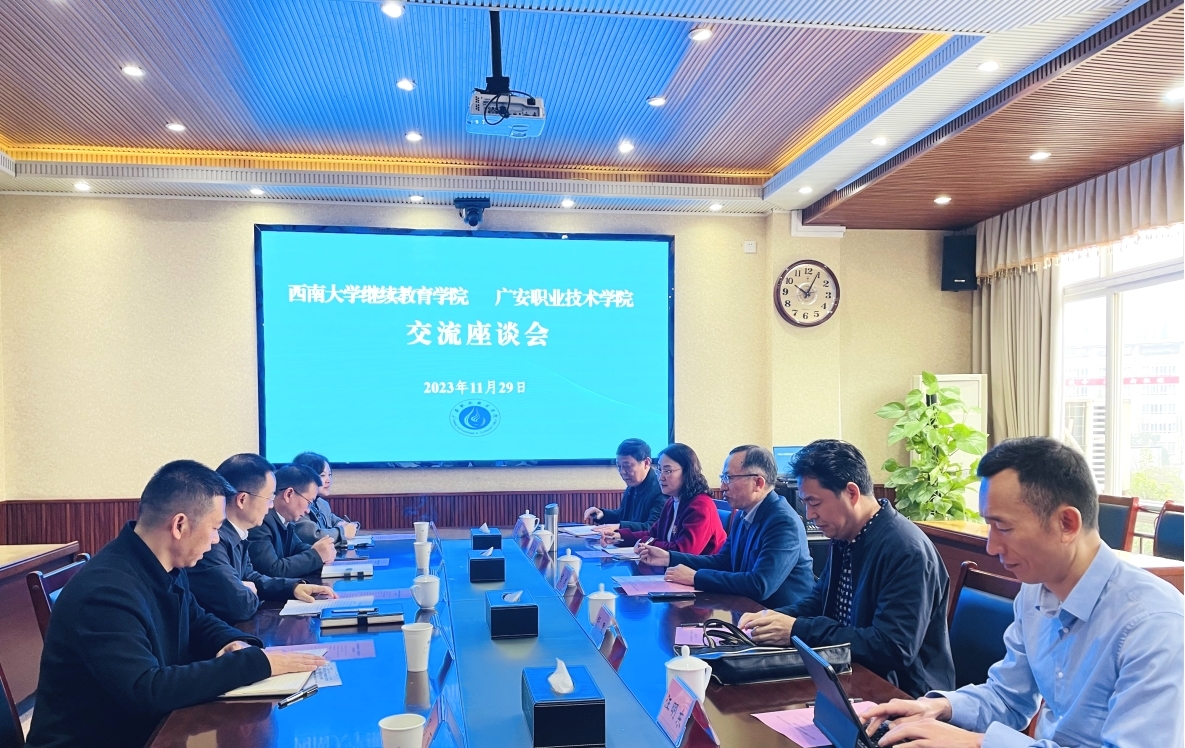 会上,陈鹏代表学校对程龙院长一行表示诚挚欢迎。在致辞中,介绍了学校在发展过程中形成的“伟人故里唯一高校”、“红色热土百年老校”、“三方共建重点院校”、“全省一流高职院校”四张“名片”,以及二届党委成立后确立的“三步走”计划,暨2025年前,全面建成省级“双高计划”院校,学校办学条件全面达到本科层次职业学校设置标准;2030年前,全面建成本科层次职业学校;2035年前,建成特色鲜明的一流职业技术大学。他表示,希望与西南大学继续教育学院在继续教育、干部培训、师资培训等方面携手共建,依托西南大学资源优势,创新合作,助力学校发展,为建设川渝合作示范区、打造重庆都市圈北部副中心、助推区域经济社会发展提供强有力的人才支撑和智力支持。