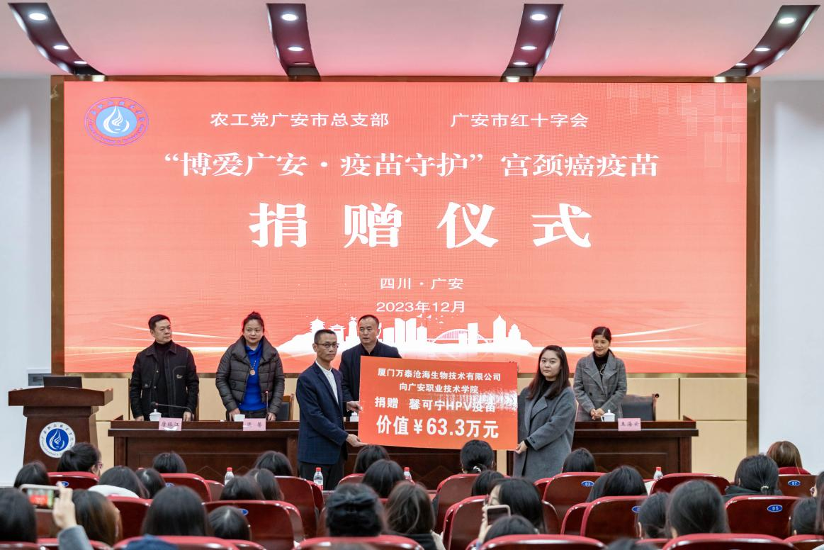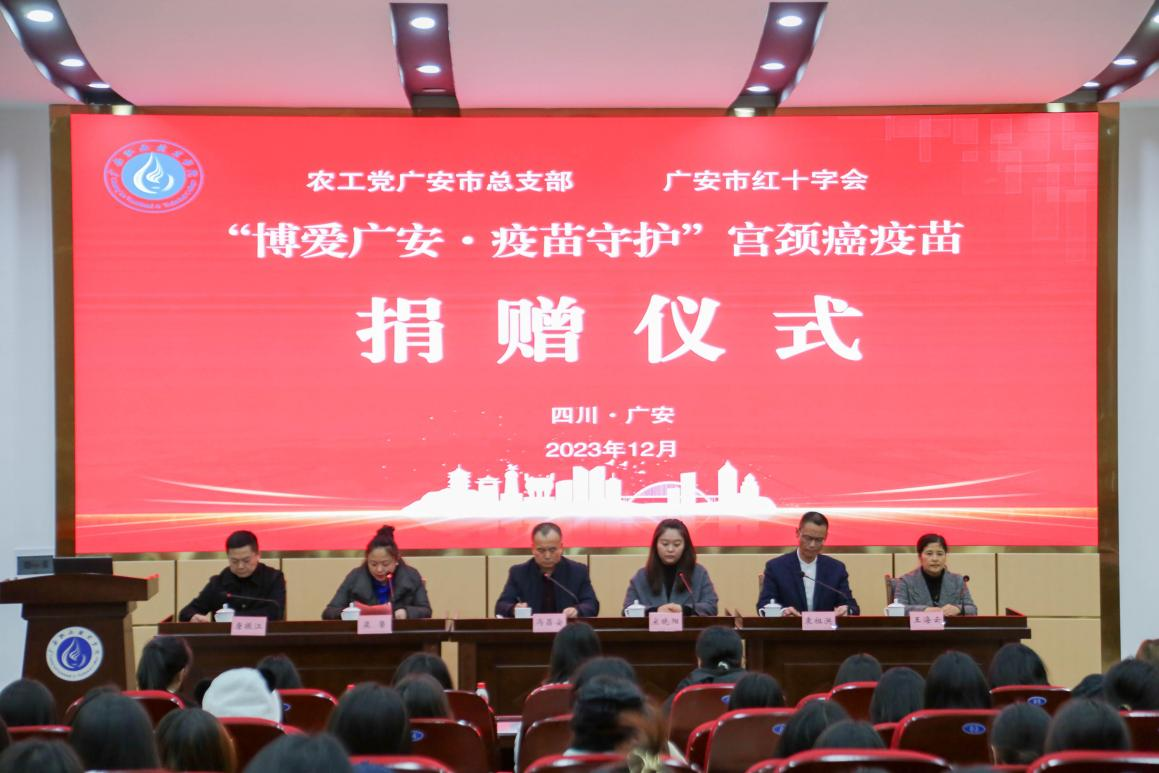 为贯彻落实“健康中国战略”,推进“加速消除宫颈癌计划”,12月15日下午,学校在希贤厅举行“博爱广安·疫苗守护”宫颈癌疫苗捐赠仪式暨宫颈癌疾病防控专题讲座活动。农工党广安市总支部主委、市政协副主席冯昌安,厦门万泰沧海生物技术有限公司经理宋晓阳,市教育体育局党组成员、副局长唐振江,市疾控中心主任、农工党广安市总支部副主委王海云,学校党委委员、副校长袁祖洪出席会议。会议由市红十字会党组书记梁馨主持。