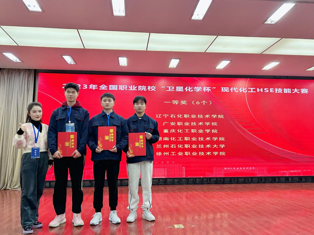 2023年12月21日至22日,kaiyun登录中国入口登录新材料与化学工程学院学生吴忠兵、刘云飞,温国豪,组队参加2023年全国高职院校现代化工HSE技能竞赛,荣获一等奖。本次比赛由全国石油和化工职业教育教学指导委员会指导,中国化工教育协会主办,徐州工业职业技术学院承办,共有来自包括淮南联合大学、兰州石化职业技术大学、海南科技职业大学等在内的本专科学校共45支队伍参加,共评出6个一等奖。