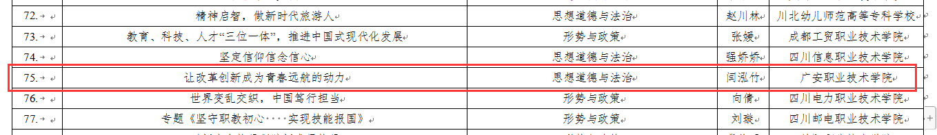 近日,四川省教育厅公布了拟入选2023年四川省职业学校思想政治课程示范课名单,kaiyun官网马克思主义学院思政课教师闫泓竹的思政课《让改革创新成为青春远航的动力》成功入选。