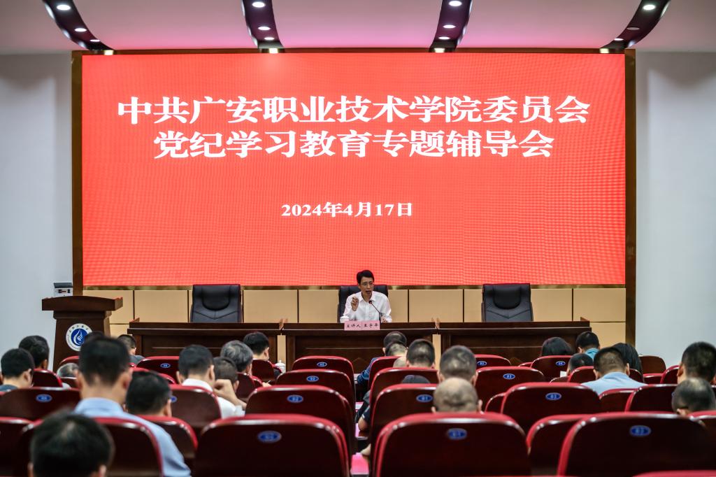 2024年4月17日下午,学校党委开展党纪学习教育专题辅导,学校中层及以上领导干部参加。党委委员、纪委书记王宇平就新《条例》联系学校实际工作进行了细致解读,引导广大党员干部进一步加深对《条例》的掌握和理解,增强法纪意识,以严明的纪律推进党的自我革命,为学校深化改革发展和“双高计划”建设提供更加坚强的纪律保障。
