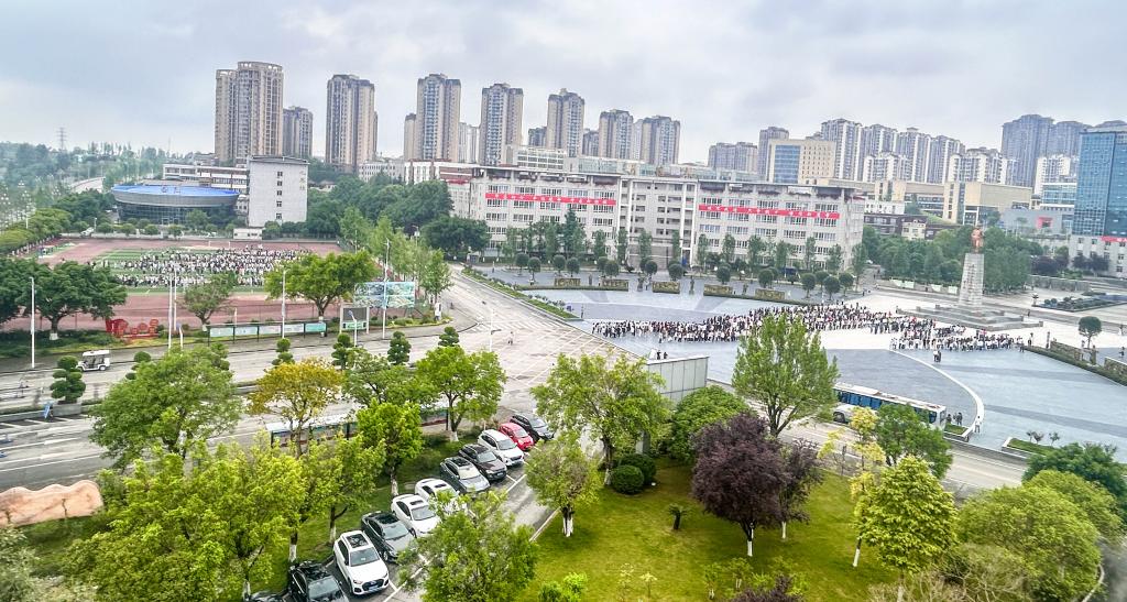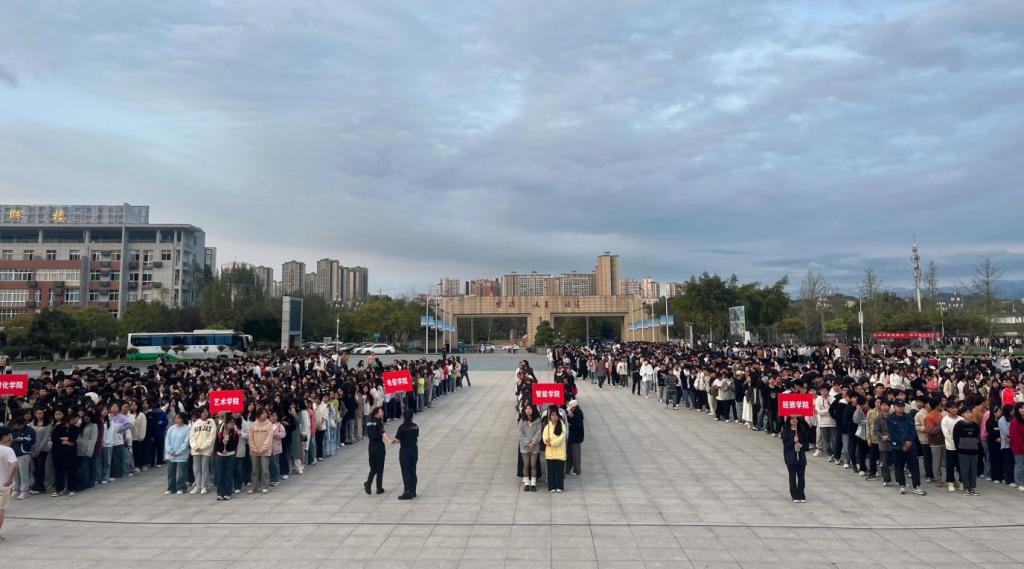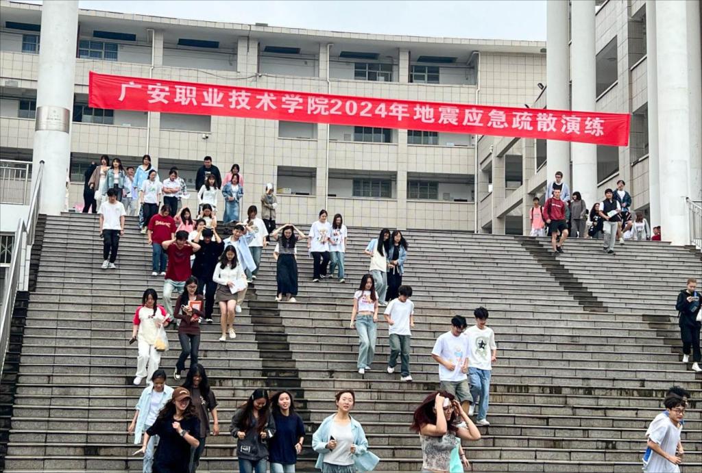 演练,模拟发生5级地震,分两个部分进行演练。首先是原地避震演练,播音员播放防空警报1分钟,期间师生原地紧急避险;然后是紧急疏散演练,播音员再次播放防空警报2分钟,师生按撤离路线有序快速疏散,分别撤离到足球场、小平广场、篮球场、羽毛球场等指定场地集合。