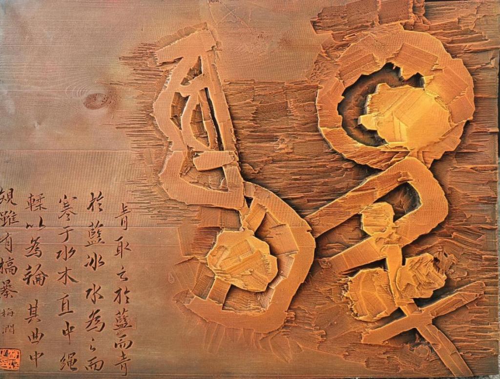 获奖作品取日月升恒意象,表达祖国繁荣昌盛、正当兴旺。作品以书法为主体,融传统刻字、篆刻、绘画、版画、雕塑等技艺于一体,采用“日”高“月”低、左浅右深布局,四周采用刀法撕裂呈现云彩光辉,展现出朝日初生、夜月犹存之景。右侧大字传达坚韧、果敢、坚实意境,左侧小字选自《劝学》,采用阴刻的方式进行展现,与大字的阳刻形成对比,使作品在刀刻上更加丰富。学校自2018年建设清修书刻艺术工作室以来,立足艺术学院专业建设,依托茂林文化艺术中心、思源文创中心等阵地,积极争取省、市、行业协会大力支持,通过技能大师“传、帮、带”,传承书刻技艺,培养技艺人才,取得了丰硕成果,师生作品屡次参加各级各类展赛获奖,尤其国、省大学生艺术展演活动中取得佳绩。