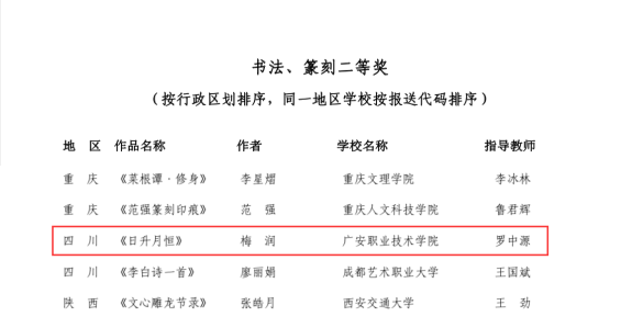 kaiyun登录中国入口登录斩获全国重大比赛二等奖1项 2024年6月,全国第七届大学生艺术展演活动在湖北省襄阳市举行,kaiyun官网学生作品《日升月恒》获书法、篆刻类二等奖1项,该作品由艺术学院罗中源老师指导,师范学院21级小学教育专业学生梅润创作。