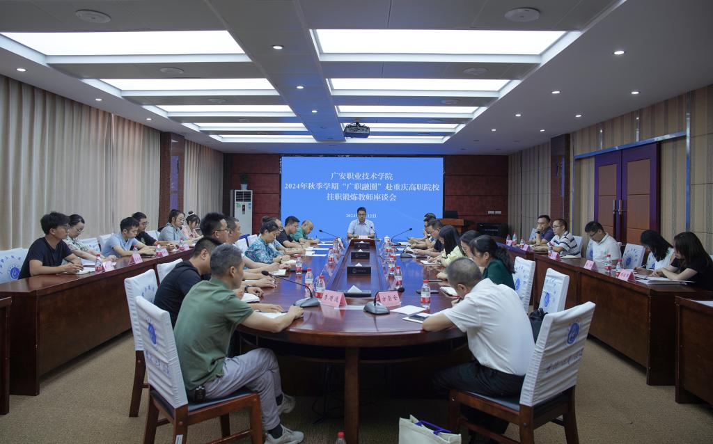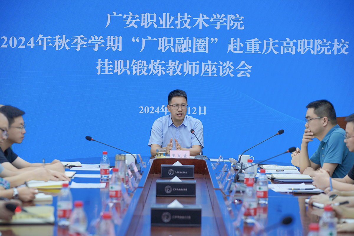 9月12日下午,学校在春晖楼四楼会议室召开“广职融圈”行动计划2024年秋季学期赴重庆高职院校挂职锻炼教师座谈会。学校党委副书记、校长王义全出席会议并讲话。会议由党委副书记陈鹏主持。校属相关职能部门负责人、有关二级学院院长及赴重庆高职院校挂职锻炼教师参加了座谈会议。