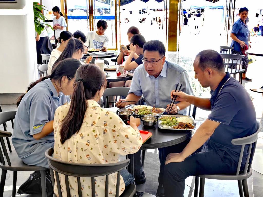 王义全校长视察了售卖大厅售餐情况、制度上墙情况、后厨操作情况等,随后在学生食堂一楼以消费者身份点餐,与同学们一同就餐。就餐时,王义全校长详细询问了学生菜品味道、分量、价格、卫生等情况,与学生交谈融洽。