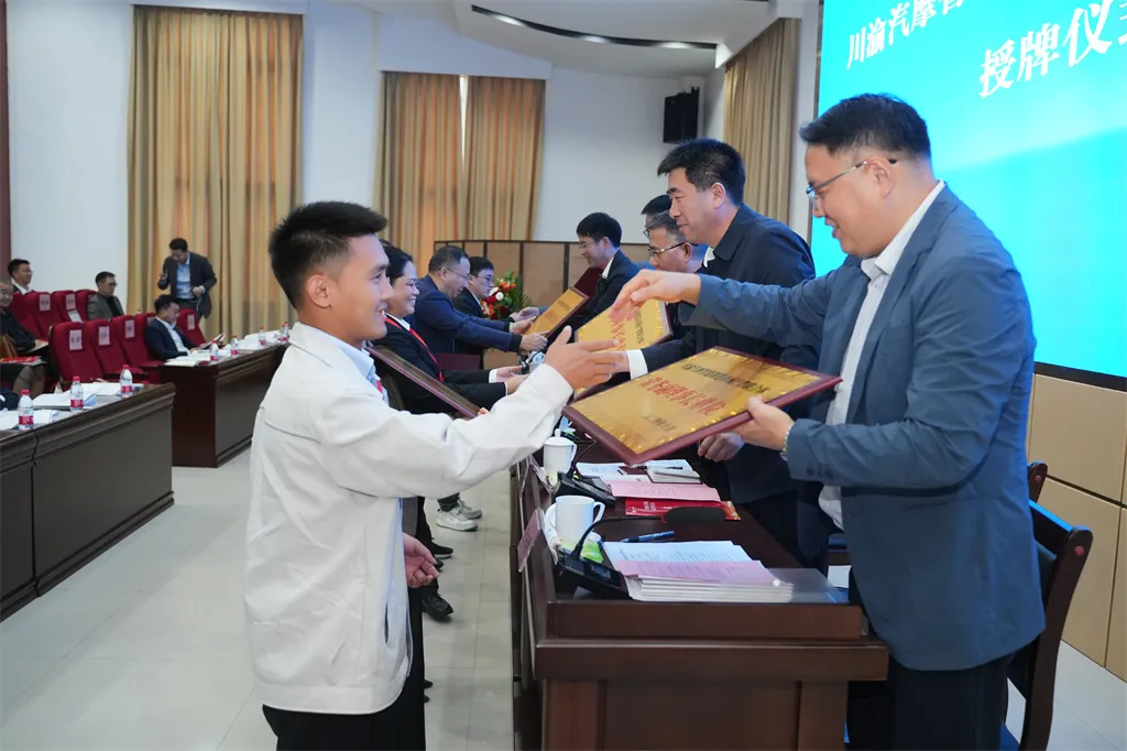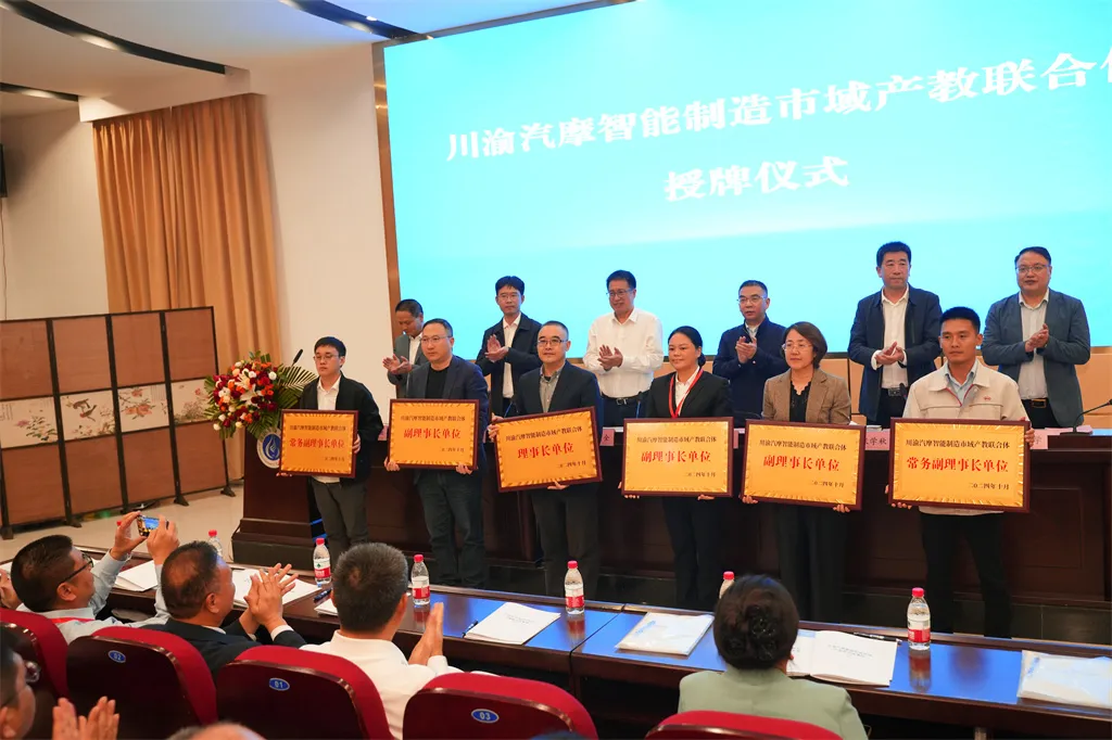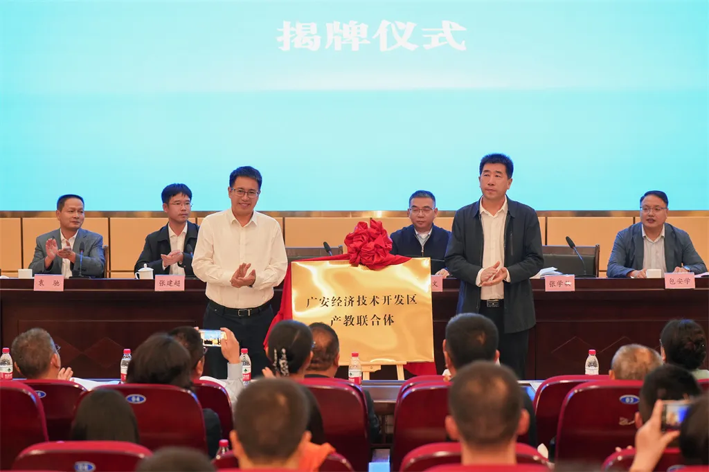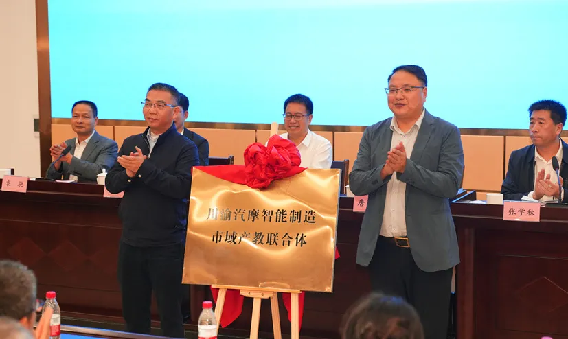 会议现场举行了揭牌仪式,在现场来宾的共同见证下,广安经济技术开发区产教联合体、川渝汽摩智能制造市域产教联合体正式成立。与会领导为理事长单位、副理事长单位颁发证书。
