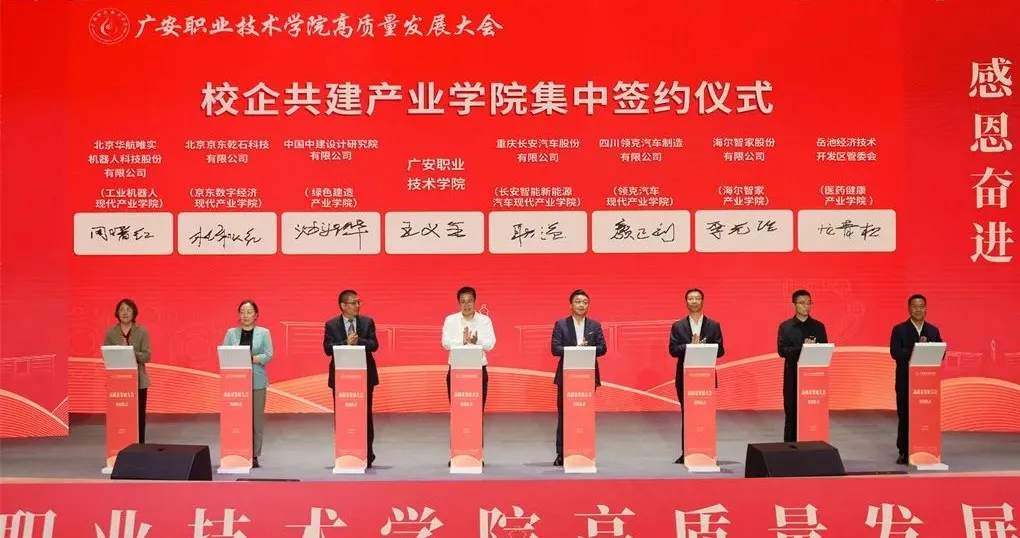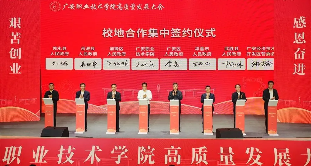 会议现场举行了校地、校企合作签约仪式。广安经济技术开发区管委会、广安区人民政府、前锋区人民政府、华蓥市人民政府、岳池县人民政府、武胜县人民政府、邻水县人民政府与学校进行校地合作签约。重庆长安汽车股份有限公司(安驿)、中国中建设计研究院有限公司、四川领克汽车制造有限公司、北京京东乾石科技有限公司、海尔智家股份有限公司、北京华航唯实机器人科技股份有限公司、岳池经济技术开发区管委会与学校进行校企合作签约。