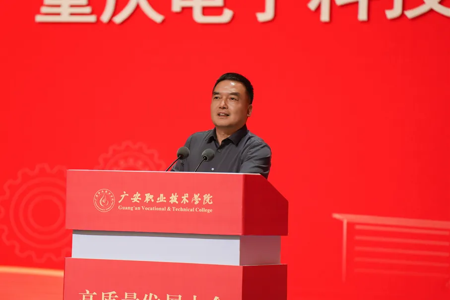 重庆电子科技职业大学校长聂强致辞,他表示,广安职院抢抓机遇、深化改革,在专业建设、课程改革等方面取得了显著的成就。两校在长期的办学历程中,建立了良好的沟通联系和合作关系,结下了深厚的情谊。在成渝地区双城经济圈建设的宏伟蓝图下,两校都肩负着服务国家重大战略、服务区域产业发展的历史使命。两校将持续深化合作交流,在人才培养、课程建设、教师发展、科研教学等方面开展更高层次、更加紧密的合作,全面探索跨省域职业教育资源开放共享共用机制,促进渝广职业教育融合协同发展。