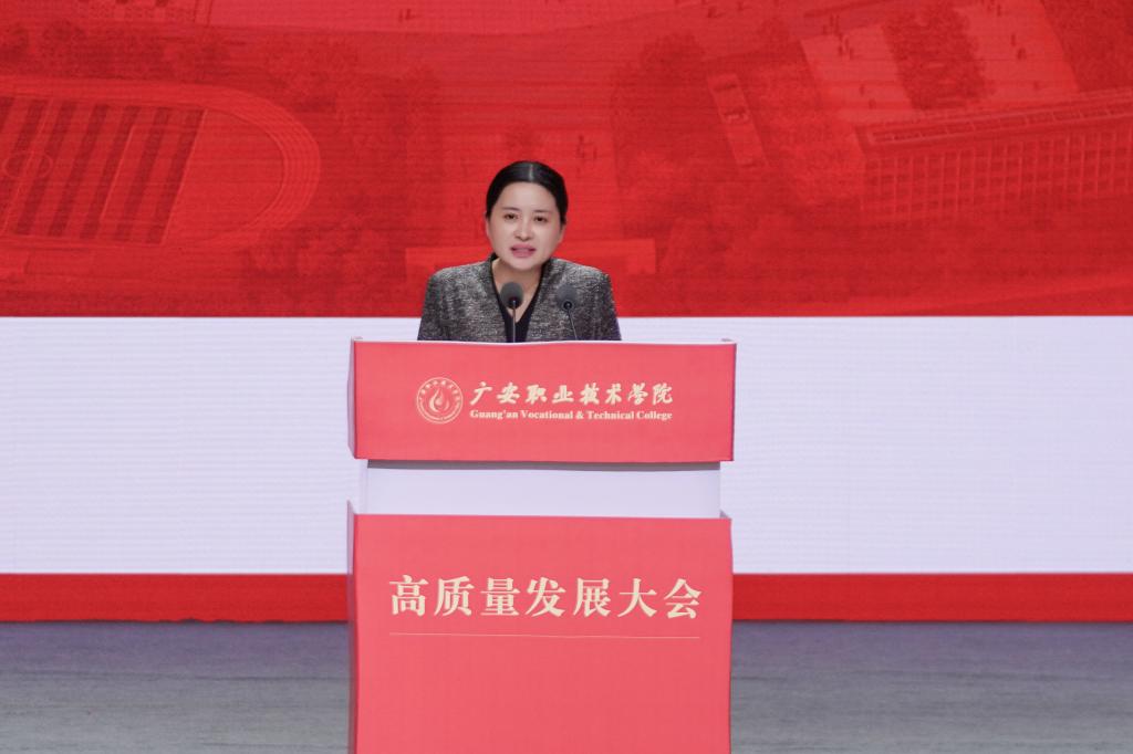 学校党委书记王冬霞作学校全面深化改革、推进高质量发展工作报告。她代表学校向莅临大会的各位嘉宾表示欢迎和感谢。王冬霞表示,学校抢抓机遇,历经省级示范校、优质校和双高校建设,参与见证了高等职业教育蓬勃发展壮丽篇章。高职20年来,广职人初心不改,始终与国家发展同心共向。坚持将党的全面领导贯穿办学治校全过程,着力打造风清气正的校园政治生态。学校先后荣获全省先进基层党组织、高校党建样板支部、五四红旗团委等称号,涌现出全国优秀教育工作者、全国优秀教师、全国孝亲爱老道德模范等优秀教师和校友。躬耕不辍,始终与职教发展同行共进。建成了一批国省特色专业、教学资源库和精品课程,与成都工业学院联合开展本科层次职业教育人才培养改革试点。学校荣获四川省教学成果奖7项,师生荣获国省职业院校技能大赛、双创比赛等奖项1500余项,建成教育部工业机器人应用人才培养中心等高水平基地。矢志不移,始终与地方发展同频共振。获批国家级、省级和市级创新平台20余个,立项省厅级科研项目360余项,省部级科研项目50余项,获批国家专利370余项,实现科技成果转化35项。完成横向技术服务项目200余项。挂牌国、省高技能人才培训基地等32个,开展培训、职业技能等级认定数十万人次。笃行不怠,始终与时代发展同步共济。积极响应“一带一路”倡议,培养来自俄罗斯、哈萨克斯坦等20多个国家的留学生200余人。落实广安市“同城融圈”首位战略,牵头实施“广职融圈”行动计划,与重庆高水平职业院校开展深度合作。