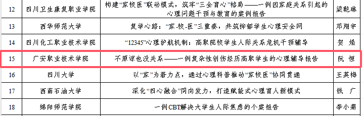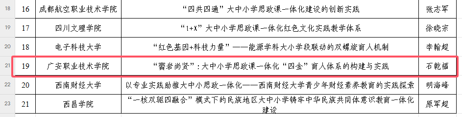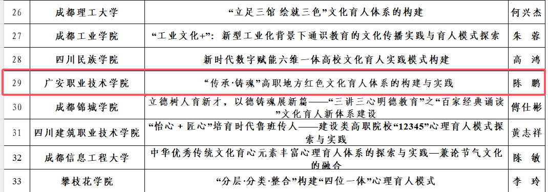近日,四川省教育厅公布了2025年度四川省高校思想政治工作质量提升综合改革与精品建设项目入选名单,kaiyun官网申报的《“传承•铸魂”高职地方红色文化育人体系的构建与实践》《中国人民的儿子》《不原谅也没关系——一例复杂性创伤经历高职学生的心理辅导案例》《“賨岩尚贤”:大中小学思政课一体化“四金”育人体系的构建与实践》4个项目成功入选公示名单(其中2个项目被推荐参加教育部精品建设项目遴选)。