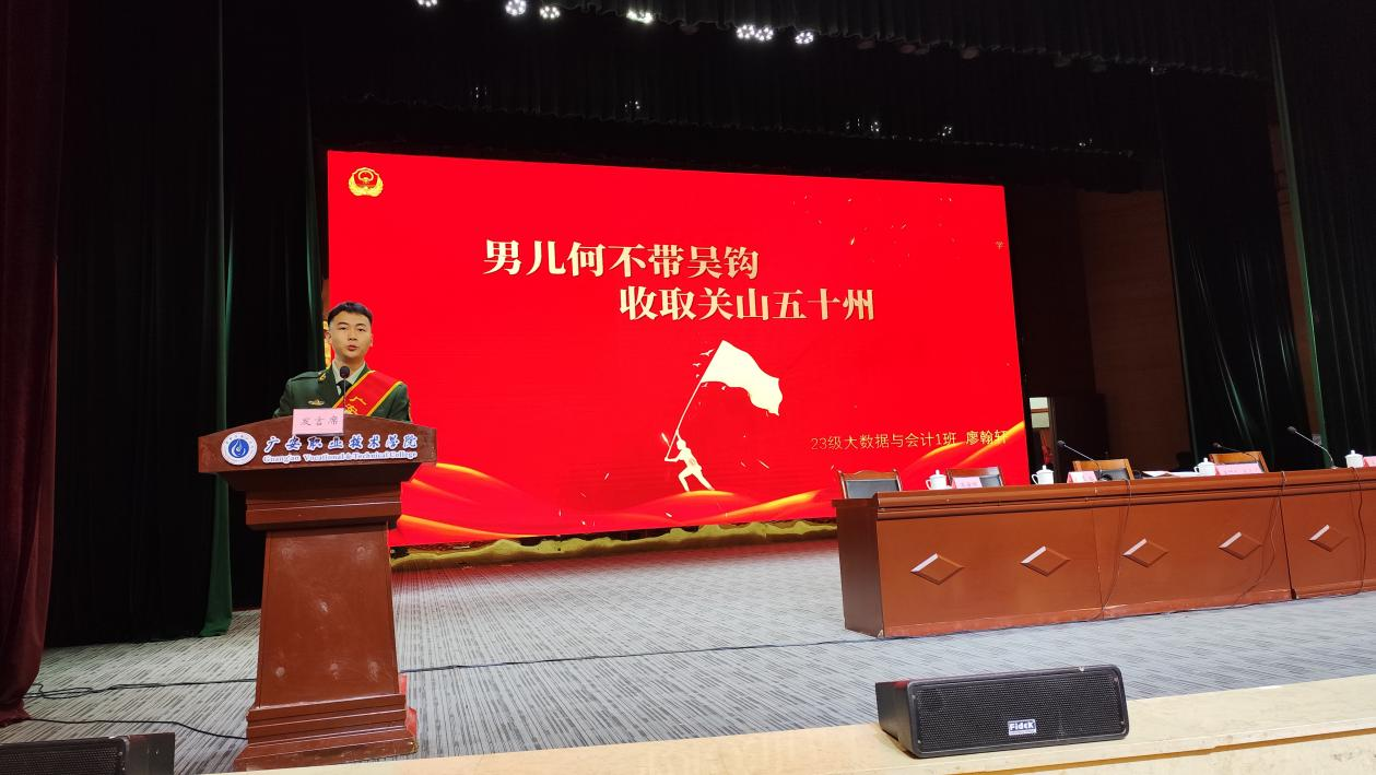经济与旅游管理学院廖翰轩、艺术与设计学院莫晨曦、师范学院唐世杰3名退役复学学生代表,分别以《男儿何不带吴钩收取关山五十州》《携笔从戎青春的最荣誉》《少年应有鸿鹄志当骑骏马踏山川》为题,分享了自己在军旅生涯中的成长经历和军旅感悟,并呼吁同学们积极响应祖国号召,踊跃报名参军,为祖国国防事业贡献自己的力量。