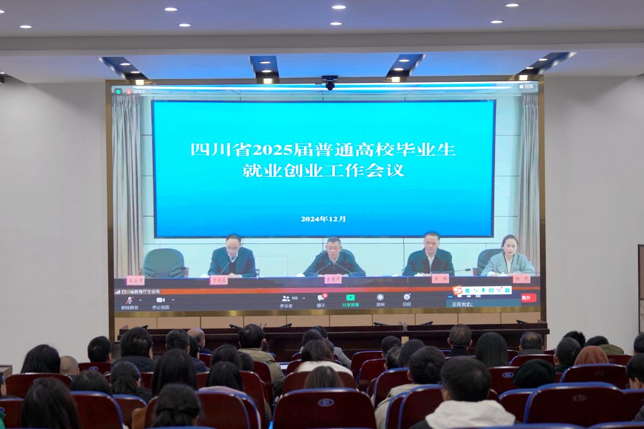 12月6日,四川省教育厅组织召开2025届全省普通高校毕业生就业创业工作视频会议。学校在希贤厅设立分会场,党委书记王冬霞,党委委员、副校长冉嘉洛,学生工作部、团委、武装部(保卫处)、教务处、对外交流与合作处、招生就业处等部门负责人,各二级学院党总支书记、就业创业工作人员、2025届毕业班班导师共计60余人参加会议。