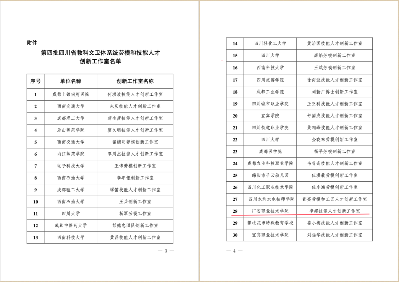 近日,四川省教科文卫工会下发《关于确认第四批四川省教科文卫体系统劳模和技能人才创新工作室的通知》,确认30个“第四批四川省教科文卫体系统劳模和技能人才创新工作室”。kaiyun官网电子与信息工程学院李超技能人才创新工作室获此殊荣。