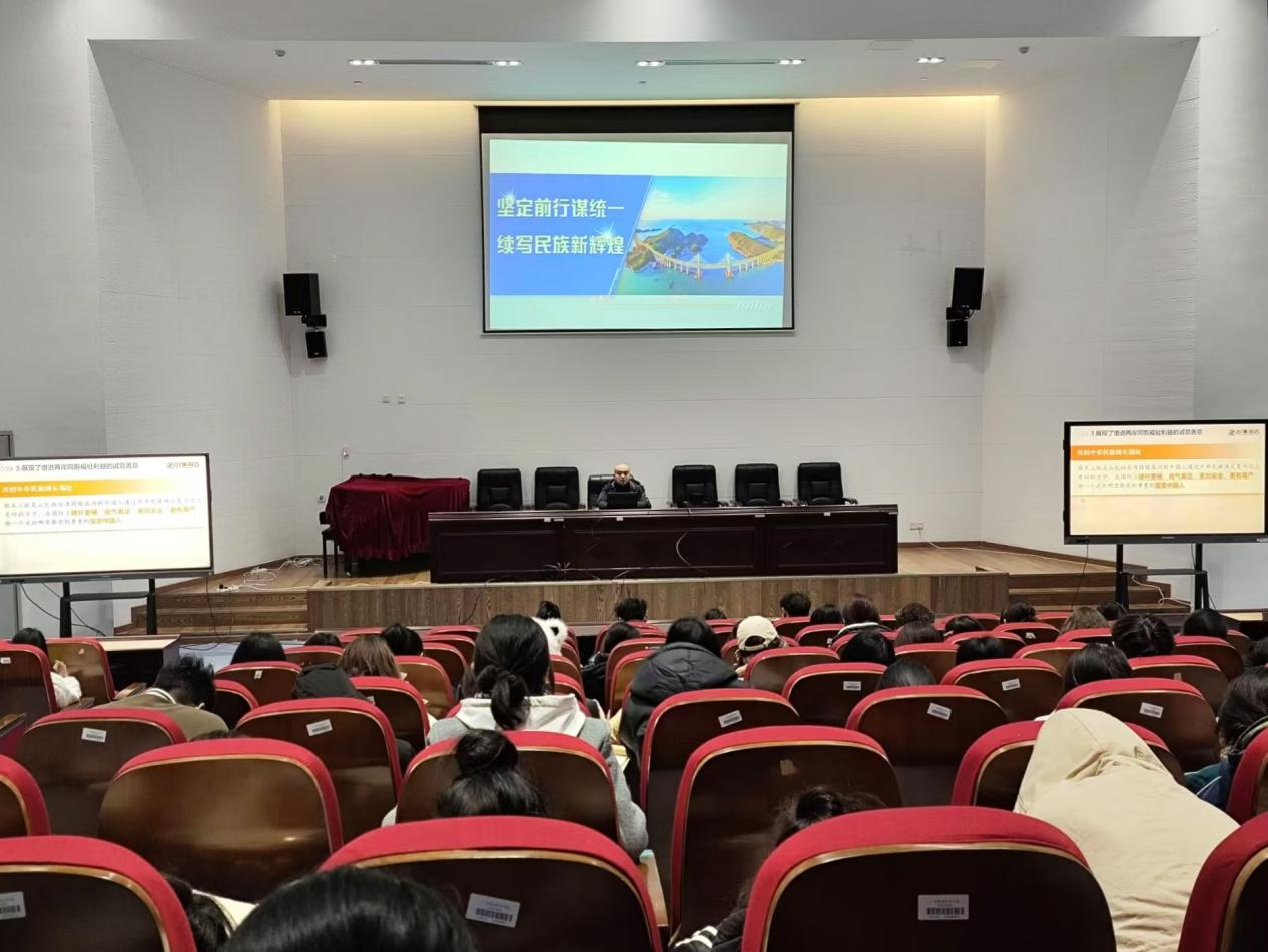 为深入学习贯彻习近平总书记对学校思政课建设作出的重要指示精神,持续推动习近平新时代中国特色社会主义思想进教材进课堂进头脑,12月9日下午,学校党委委员、副校长冉嘉洛以“坚定前行谋统一,续写民族新篇章”为题,在岳秀楼翔凤厅为师范学院160余名师生讲授了一堂精彩而深刻的形势与政策课。
