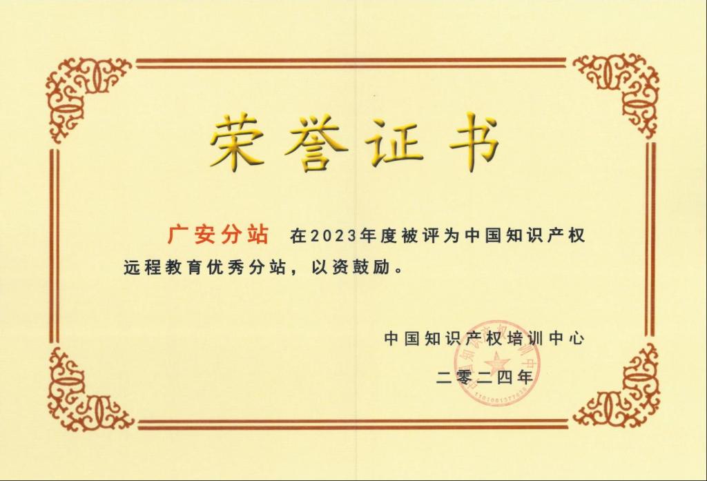 近日,中国知识产权培训中心公布了中国知识产权远程教育总平台对2023年度全国各分站的考核评估结果,kaiyun登录中国入口登录分站(以下简称广安分站)在全国188个分站中位列第15名,获全国“优秀分站”荣誉称号。