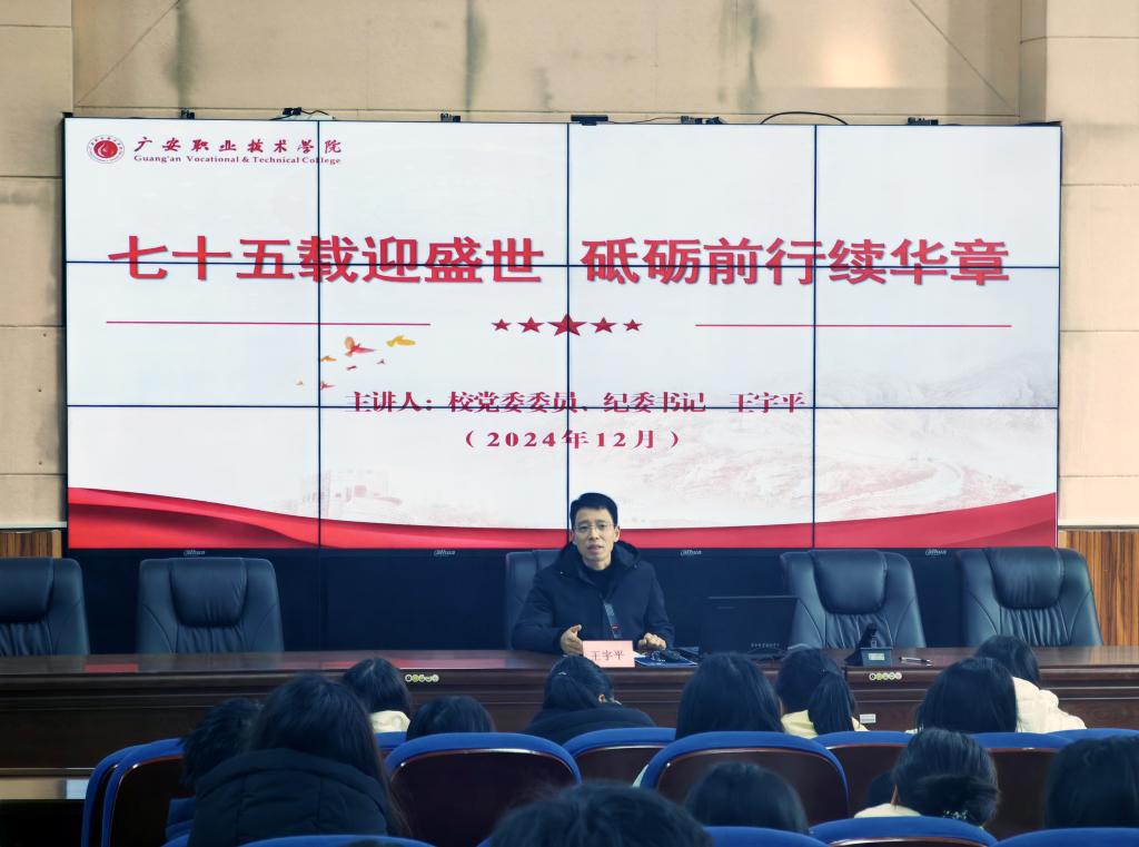 为深入学习贯彻习近平总书记对学校思政课建设作出的重要指示精神,全面贯彻党的教育方针,落实立德树人的根本任务,12月17日下午,学校党委委员、纪委书记王宇平以“七十五载迎盛世 砥砺前行续华章”为主题,在紫金厅为经济与旅游管理学院学生讲授了一堂精彩而深刻的形势与政策课。