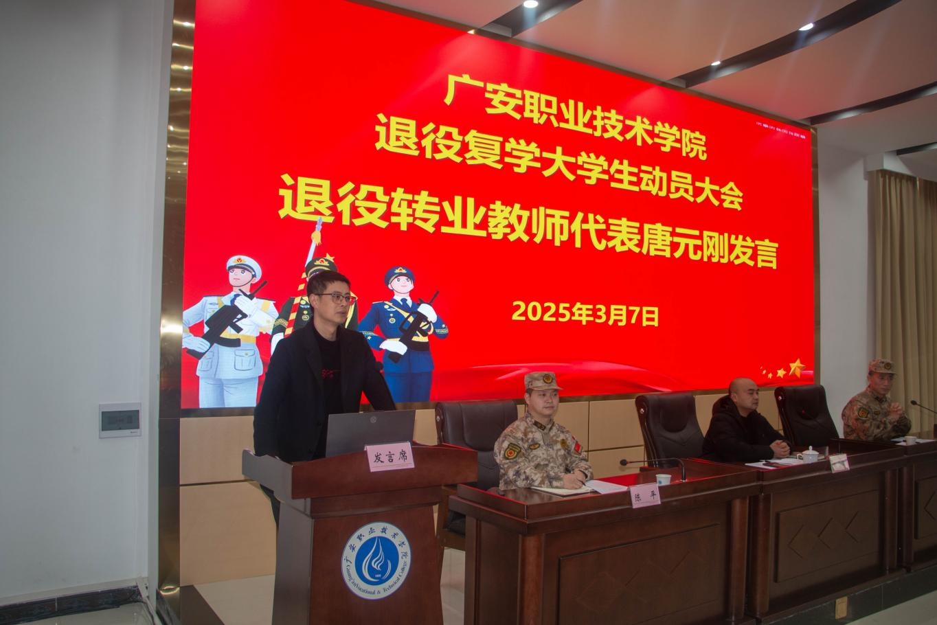 学校转业教师代表唐元刚,分享了自己如何从一名普通转业士官,一步步成长为学院党总支部副书记。并向退役复学的小战友们提出了三点建议:一是要构筑终身学习战壕,始终保持终身学习的态度;二是要架设情感友谊桥梁,真诚对待身边的每一个人;三是勇于开辟“第二战略纵深”,在新的领域中再创佳绩。