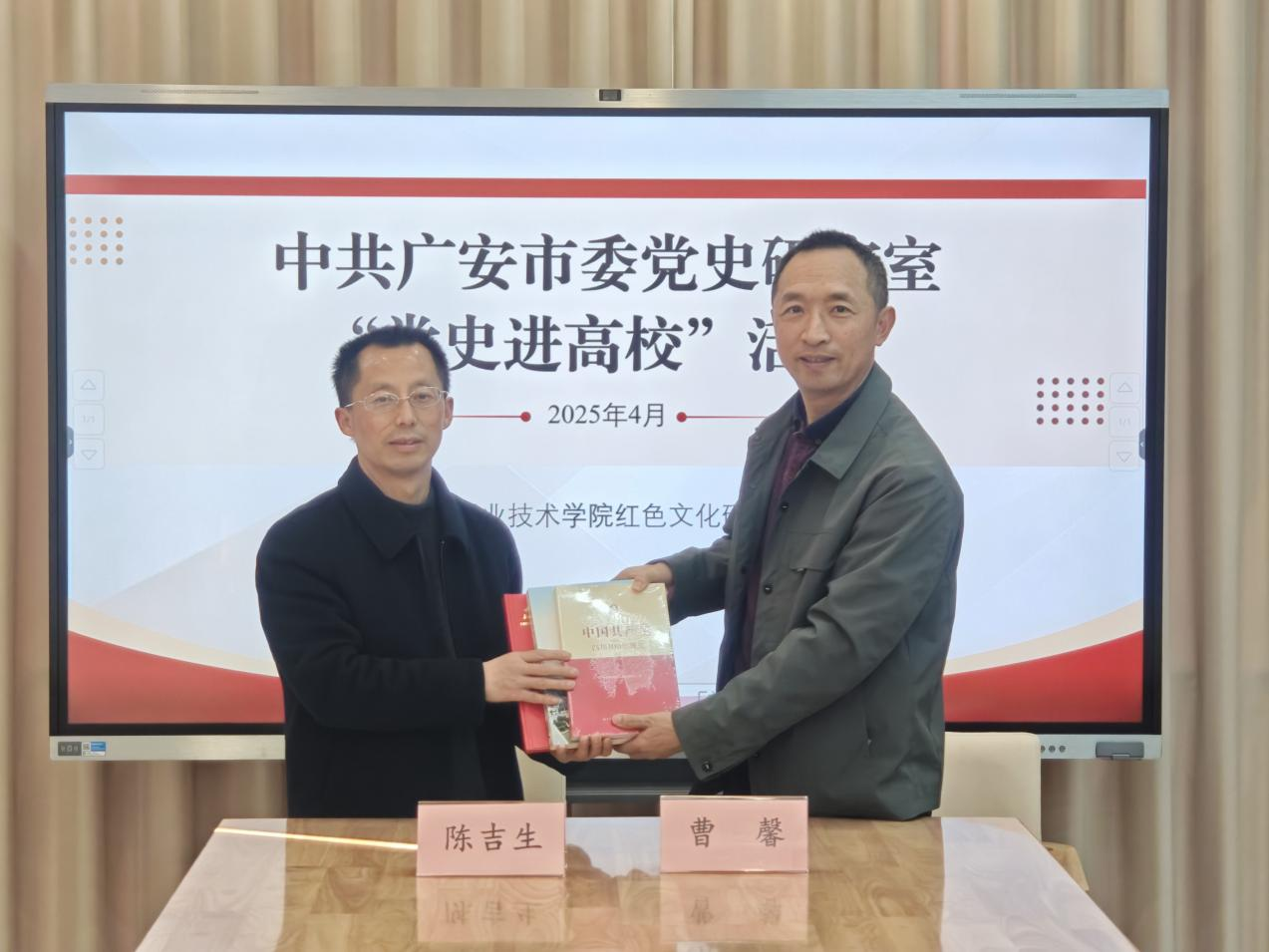 4月7日下午,中共广安市委党史研究室主任陈吉生带队到学校开展“党史进高校”活动。学校党委委员、宣传统战部部长孔新海参加交流座谈,红色文化研究中心主任曹馨主持座谈会。