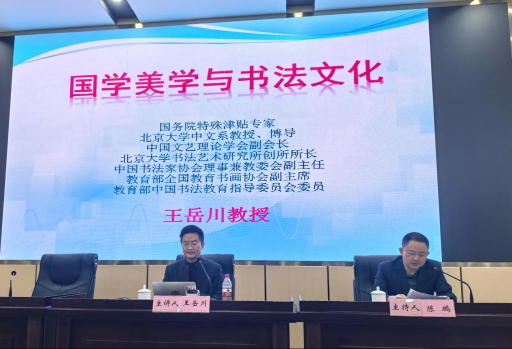 为弘扬传统文化,提升师生对国学美学与书法文化的认知与兴趣,4月26日学校在希贤厅举办了一场主题为《国学美学与书法文化》的学术讲座,特别邀请到了北京大学著名教授王岳川先生担任主讲嘉宾。校内师生及校外文艺爱好者240余人到场聆听,讲座由学校党委副书记陈鹏主持。