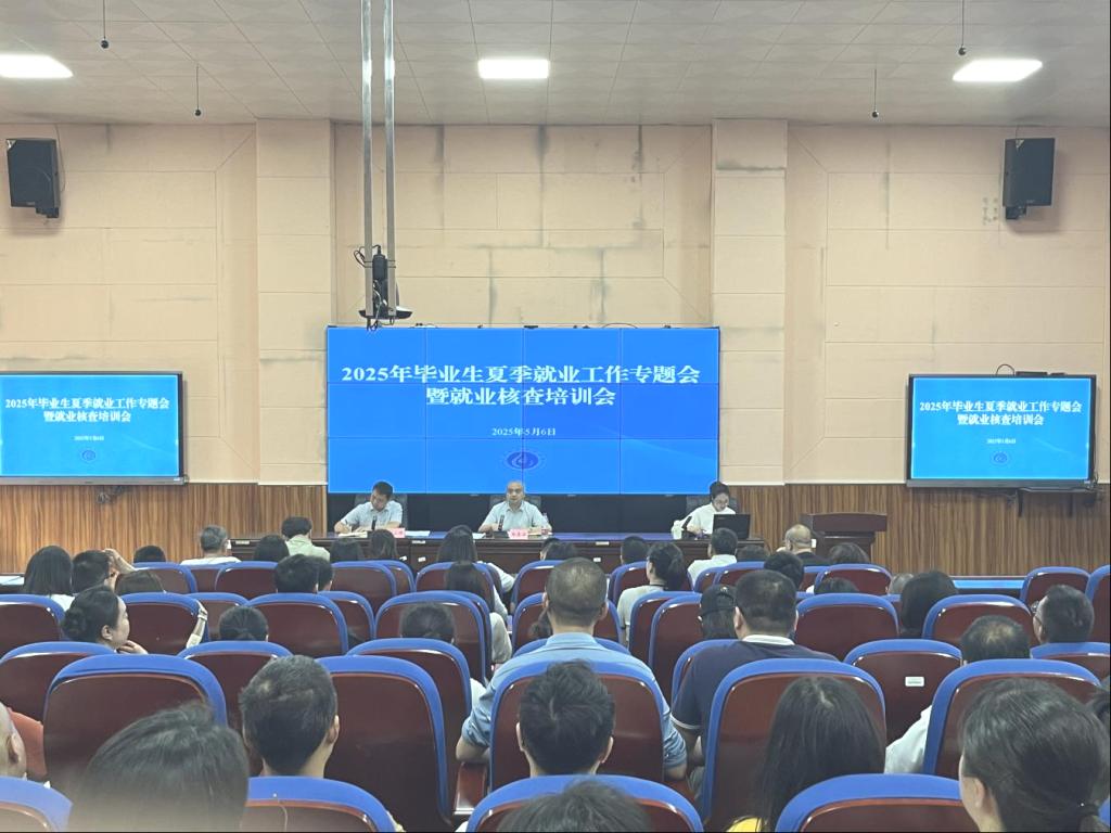 5月6日下午,学校在致用楼紫金厅召开2025年夏季就业工作专题会暨就业核查培训会。党委委员、副校长冉嘉洛出席会议并讲话,招生就业处处长,各二级学院党总支书记,就业工作人员以及2025届毕业班辅导员参加会议。