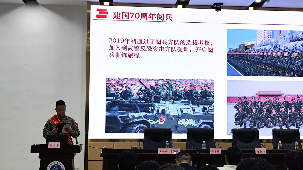 熊未林代表广安区人民政府征兵办公室,围绕大学生入伍优惠政策、发展前景与退役保障、应征入伍条件、应征入伍流程、军营生活、谨防征兵诈骗和算好参军五笔账七个方面内容,给同学们作了一场深入人心的国防教育和参军入伍政策宣讲。