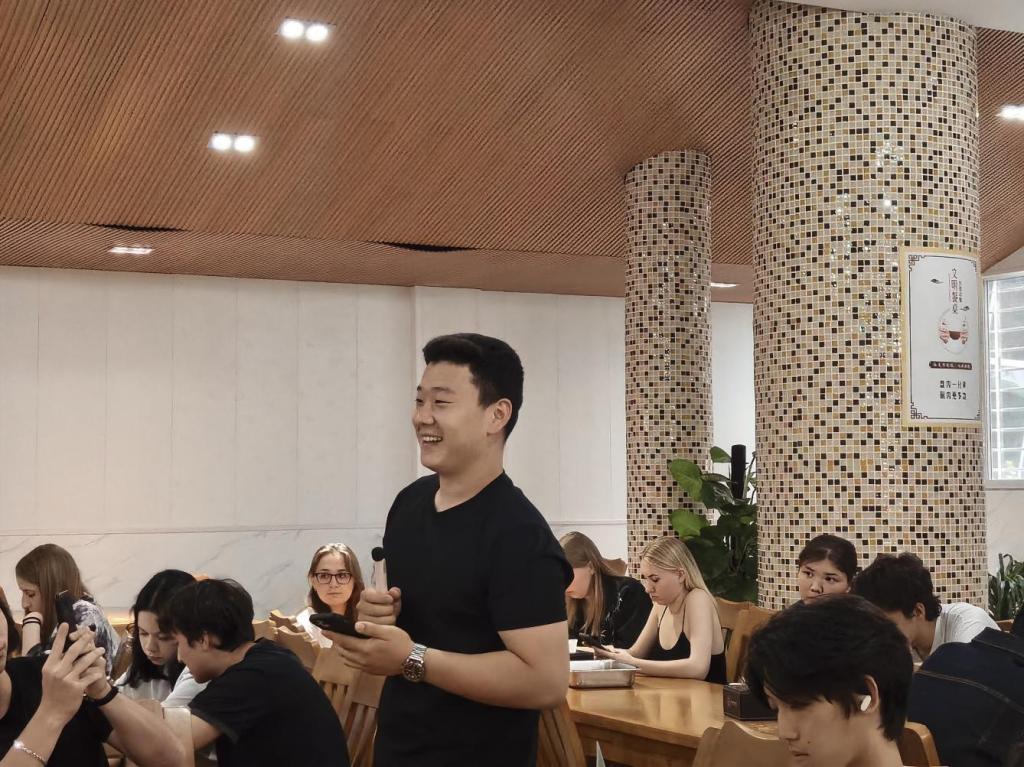 溯千年源流,悟奋进精神。活动伊始,袁驰以温润话语,为留学生们徐徐铺开端午节的千年历史画卷。他生动讲述屈原的爱国情怀与节日源起,详解赛龙舟、吃粽子等传统习俗。在趣味问答环节,同学们争相竞答,现场气氛活跃热烈,互动频繁。当大屏幕展现龙舟击水、百舸争流的磅礴画面时,他以“逆流行舟,不进则退”深情勉励学子们:“求学之路亦如逆水行舟,唯有奋发向上,勇毅前行,方能抵达理想彼岸。”这番铿锵寄语,将传统文化精髓升华为跨越国界的进取力量,在留学生心中激起强烈共鸣。