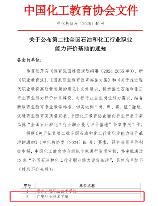 近日,从中国化工教育协会传来喜讯,学校成功获批成为全国石油和化工行业职业能力评价基地。这一荣誉的取得,标志着学校在化工职教领域的教育教学水平、实践实训能力以及影响力获得了高度认可,为学校进一步深化产教融合、提升人才培养质量提供了新的契机。