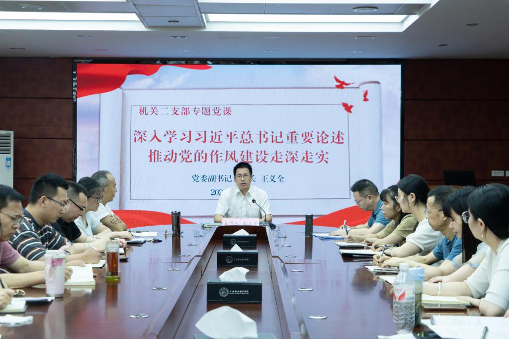 6月27日,学校党委副书记、校长王义全为机关二支部讲授专题党课,此次党课以“深入学习习近平总书记重要论述,推动党的作风建设走深走实”为主题,紧密围绕中央八项规定精神学习教育展开,引导党员干部深刻领悟作风建设的重要性,增强思想自觉与行动自觉,为学校高质量发展注入强劲动力。