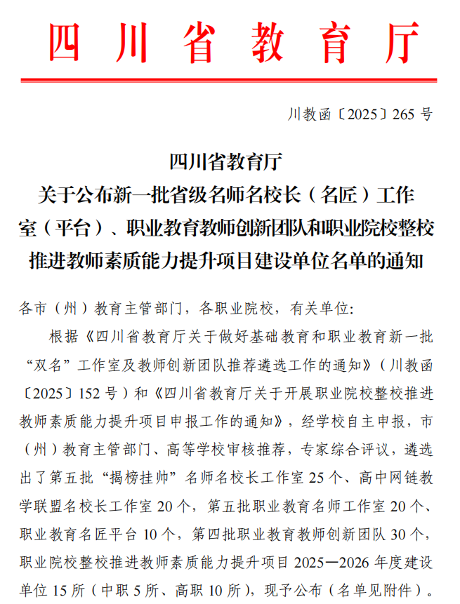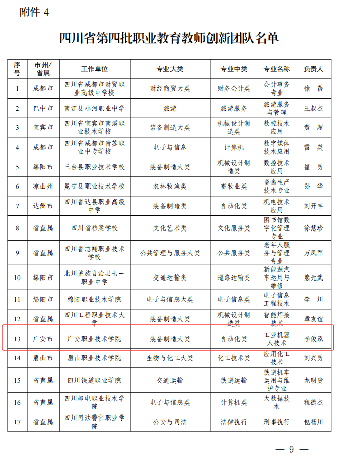 近日,四川省教育厅公布了《关于公布新一批省级名师名校长(名匠)工作室(平台)、职业教育教师创新团队和职业院校整校推进教师素质能力提升项目建设单位名单的通知》,kaiyun官网由李俊泓教授领衔的工业机器人技术教学团队成功入选四川省第四批职业教育教师创新团队。这是学校工业机器人技术省级高水平专业群建设取得的又一标志性成果。