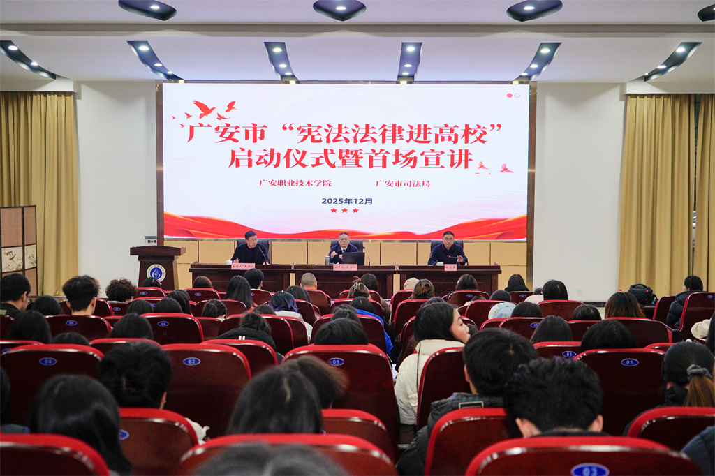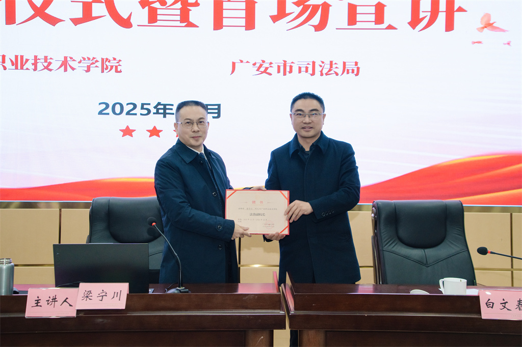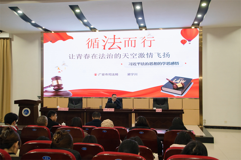 为进一步弘扬宪法精神,深植法治信仰,引领广大青年学生学思践悟习近平法治思想,12月3日,kaiyun登录中国入口登录、广安市司法局联合开展“宪法法律进高校”活动。广安市司法局党组成员、副局长梁宁川为200余名师生带来了一场以“循法而行,让青春在法治的天空激情飞扬”为主题的学习贯彻习近平法治思想专题讲座。学校党委委员、组织部部长白文春致辞,并为梁宁川同志颁发了法治副校长荣誉证书。