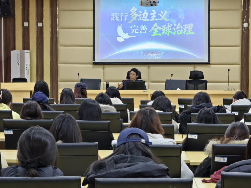 王宇平从当前百年变局加速演进的国际形势切入,系统梳理了多边主义的理论渊源、历史实践与当代挑战。他重点阐释了中国在全球治理中的角色与主张,强调中国始终是多边主义的坚定倡导者和实践者。结合经济与旅游管理学院的专业特色,王宇平勉励同学们要将个人发展融入国家大局与全球进程,积极关注全球产业链重构、数字经济治理、国际发展合作等,在促进人文交流、文旅融合发展、讲述中国故事等方面主动作为。他强调,青年学子应拓宽视野、胸怀天下,深刻理解中国主张、中国智慧对于破解全球治理困境的深远意义,在未来各自的领域内,积极推动国际合作,做多边主义的拥护者、全球治理的参与者。