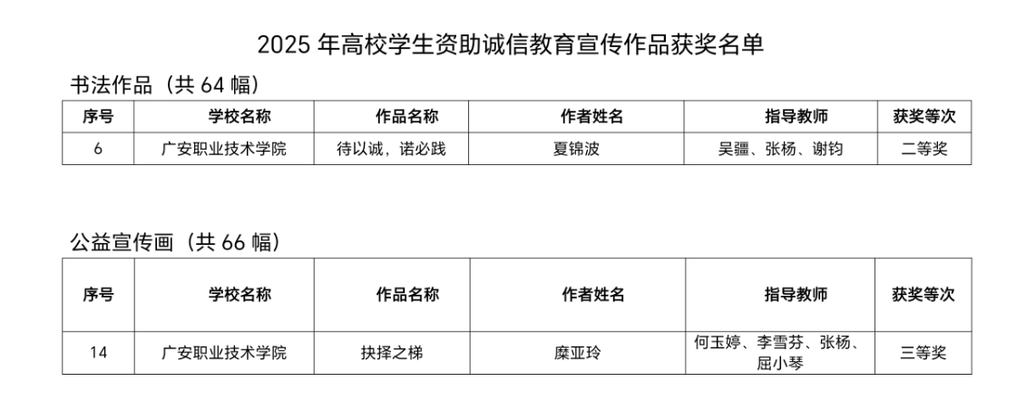 近日,四川省教育厅、中国人民银行四川省分行公布了2025年全省高校学生资助诚信教育宣传作品获奖名单,kaiyun官网荣获优秀组织奖,建筑工程学院工程造价专业2022级1班夏锦波创作的书法作品《待以诚,诺必践》荣获二等奖,师范学院小学教育专业2023级3班糜亚玲创作的公益宣传画《抉择之梯》荣获三等奖。