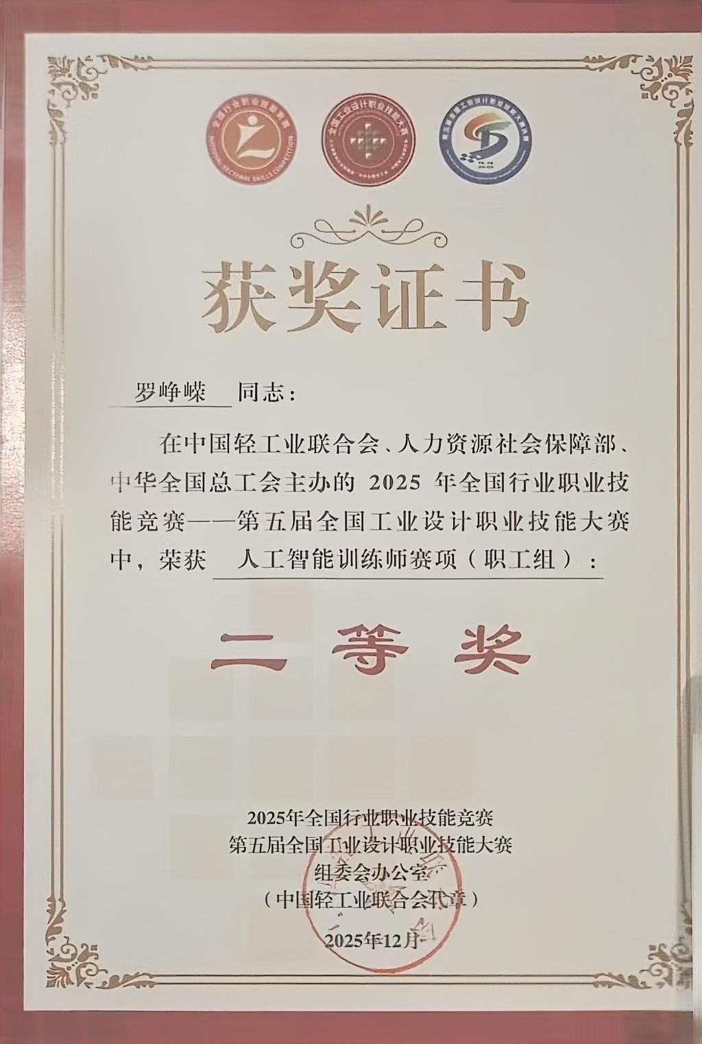近日,第五届全国工业设计职业技能大赛全国总决赛在浙江宁波圆满落幕。kaiyun登录中国入口登录电子与信息工程学院专任教师罗峥嵘在比赛中发挥出色,经过激烈角逐,最终在人工智能训练师赛项中荣获全国总决赛二等奖,展现了扎实的专业技能与优秀的职业素养。