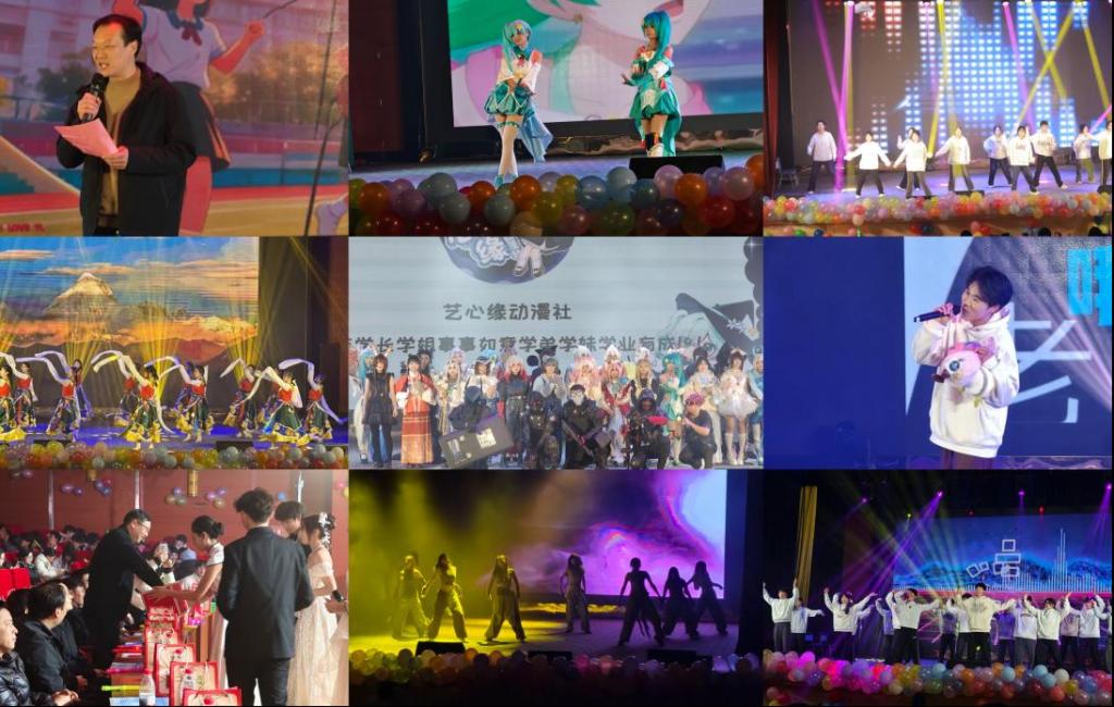 开场舞《MACHIKA》节奏炸裂,大学生艺术团街舞队通过活力满满的表演,瞬间点燃现场氛围;歌曲《想你的夜》温情款款,诉说着同窗之间的不舍;民族舞队的《雪域金山》身姿曼妙,水袖翩跹间展现出浓郁的民族风情;艺心缘动漫社的《多元走秀》创意十足,cosplay造型各异,尽显青春个性;小品《时间都去哪了》通过演绎校园时光的珍贵,提醒同窗把握当下、不负韶华,带着成长继续奔赴新征程;合唱《明天会更好》表达了学弟学妹对学长学姐在未来人生征途上的美好期许,引得现场观众频频共鸣。