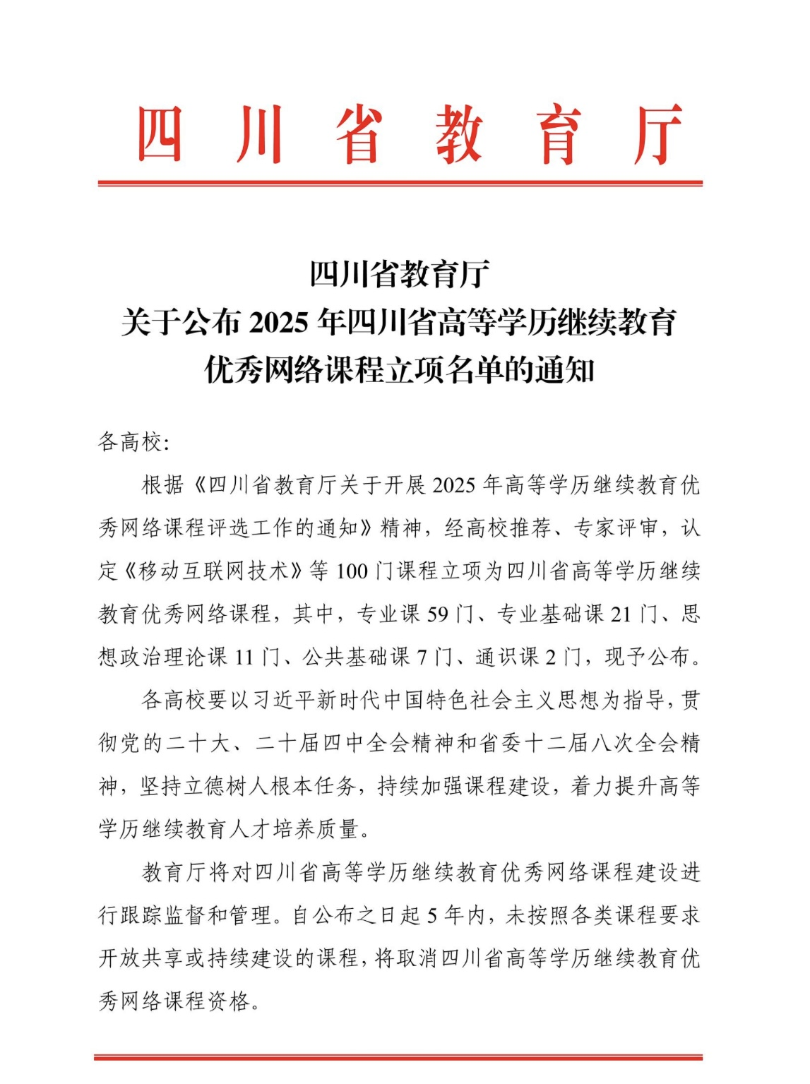 近日,四川省教育厅公布《2025年四川省高等学历继续教育优秀网络课程立项名单》,学校申报的《母婴护理》《工业机器人现场编程》《学前心理学》三门专业课程,凭借鲜明的建设特色、扎实的教学基础与突出的育人价值成功入选。这是学校在继续教育领域首次斩获省级优秀网络课程殊荣,也是学校在继续教育课程建设中的重要突破。