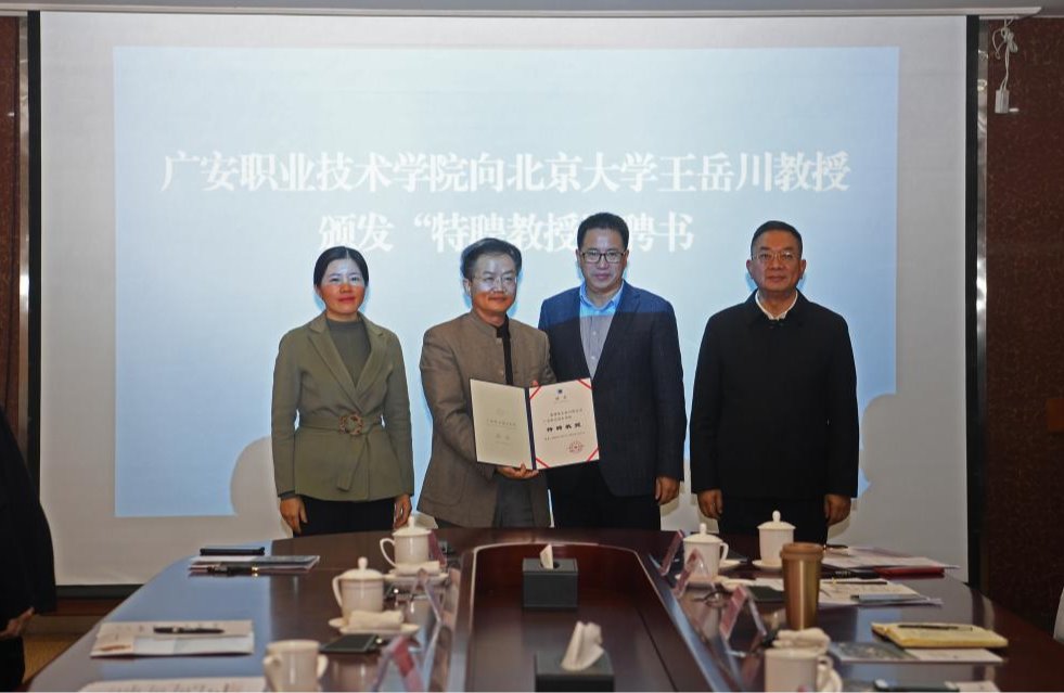 座谈会上,学校党委副书记、校长王义全介绍了学校建设发展情况及“王岳川国学书法工作室”规划情况;王岳川教授介绍了自己的成长历程,并就国学与书法的传承和传播等进行了分享交流。洪丽在讲话中指出,王岳川教授受聘为广安职院教授,能够提升学校办学水平,能推动广安在美育、国学与书法教育方面迈上新的台阶,希望学校进一步加强美育教育,培养具有审美修养的高素质技术技能人才。会上,王义全代表学校向王岳川教授颁发了特聘教授聘书,王岳川教授向学校赠送了书法作品。