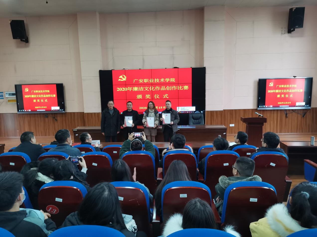 会议宣读了《中共广安职业技术委员会关于2020年廉洁文化创作比赛评选结果的通报》,并对获奖的单位和个人颁奖。与会人员还集中观看了大型电视纪录片《为了和平》,学习了《中国共产党问责条例(2019)》《中华人民共和国公职人员政务处分法》。