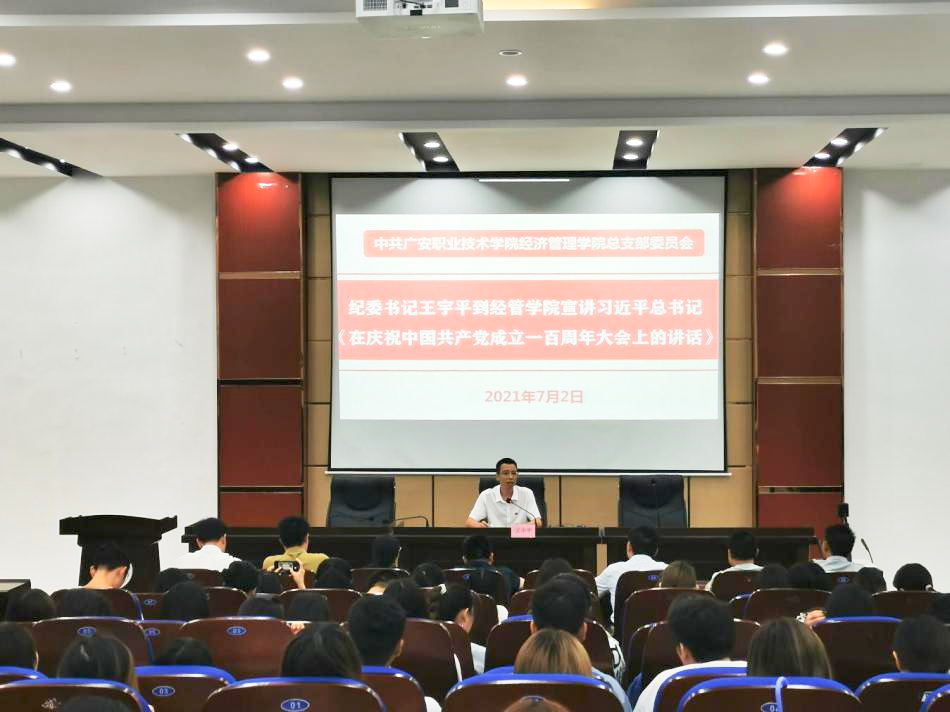 7月2日下午,学校党委委员、纪委书记王宇平在明德楼“先圣厅”为经管学院师生讲党课。王宇平围绕学习贯彻习近平总书记在庆祝中国共产党成立一百周年大会上的讲话精神,加强党史学习教育,加强学校党风廉政建设,严明纪律规矩进行专题宣讲。会议由经济管理学院党总支书记喻忠主持,经管学院师生代表100余人聆听了宣讲。