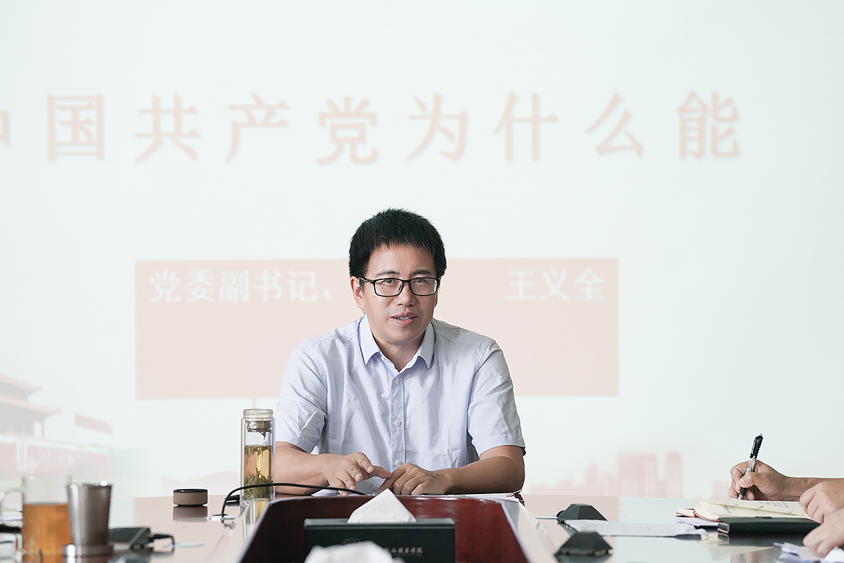 王义全首先组织全体党员学习了习近平总书记“七一”重要讲话和“七一勋章”颁授仪式的讲话精神。他指出,正是一代又一代共产党人的坚守,我们才迎来了全面小康社会的盛世,我们作为高校党员教师,更应该把握时代脉搏,聆听时代声音,在“立德、立功、立言”上做出自己的贡献。随后,王义全以《中国共产党为什么“能”》为题,给大家上了一堂党史学习的专题党课。他从历史的选择和中国传统文化两方面入手,深入浅出地为大家阐释了为什么只有中国共产党能带领中国人民从实现温饱,到全面小康,再到追求更加富裕美好新生活这一宏大命题。会议最后,王义全从加强纪律建设方面,给全体党员同志提出了要求,要大家守规矩、讲规矩,要不断强化政治担当,主动履职尽责,要保持高尚政治操守,坚守清正廉洁底线,做新时代的合格党员。
