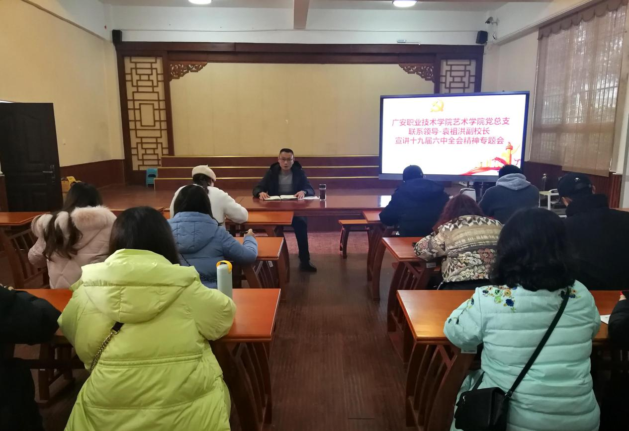 为全面深入学习领会党的十九届六中全会精神,引导学院党员干部和师生立足岗位、敬业奉献、立德树人、服务社会,充分发挥基层党组织战斗堡垒作用和党员先锋模范作用,践行初心使命,1月10日上午,学校党委委员、副校长袁祖洪到艺术学院开展党的十九届六中全会精神宣讲,艺术学院全体党员参加本次宣讲会。