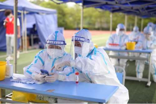 5月17日下午,滨江校区组织近万名师生开展全员核酸检测。来自学校各二级学院、职能部门等20名青年教师积极投身到学校疫情防控志愿工作中。通过专业的培训,教师志愿者们熟练掌握了防护服的穿脱、核酸检测扫码流程等动作要领。培训结束后,教师志愿者们穿上防护服变身为“大白”,迅速投入到核酸检测中,配合采样人员顺利工作,在规定时间内顺利完成滨江校区的全员核酸检测任务。