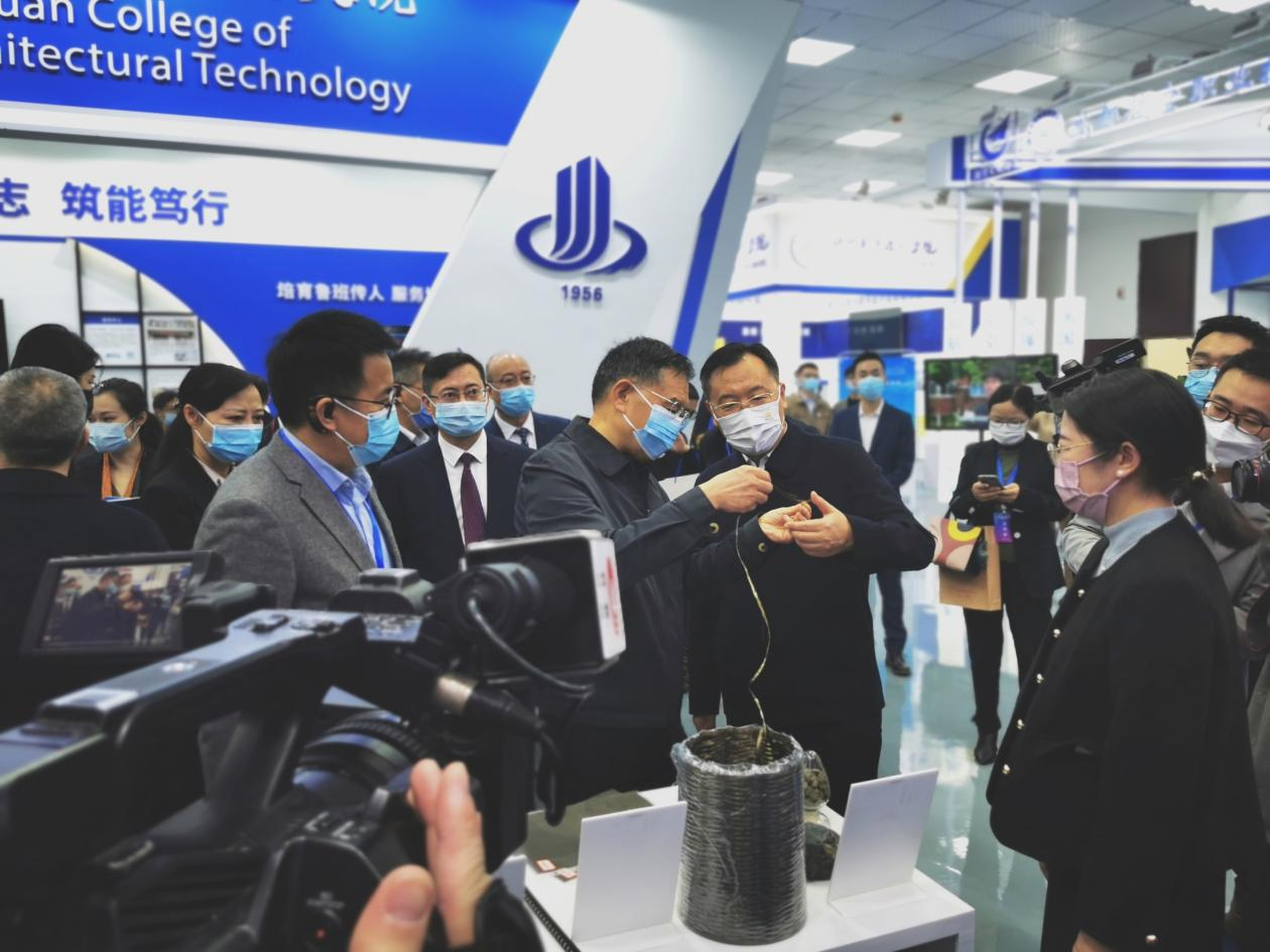学校对本次博览会高度重视,成立专班,协同各单位提前谋划、周密协调,充分准备,学校党委副书记、校长王义全赴现场指导布展工作。学校展区以“校企合作成果现、产教融合谱新篇”为主题,通过展示玄武岩复合新材料、应用工艺品实物,结合视频、图文、宣传手册等形式,全面展示学校以产教融合为主线,服务区域重点产业,与四川玄武岩纤维新材料研究院(创新中心)、四川帕沃可矿物纤维制品集团有限公司三方开展产学研一体化发展的重要成果。