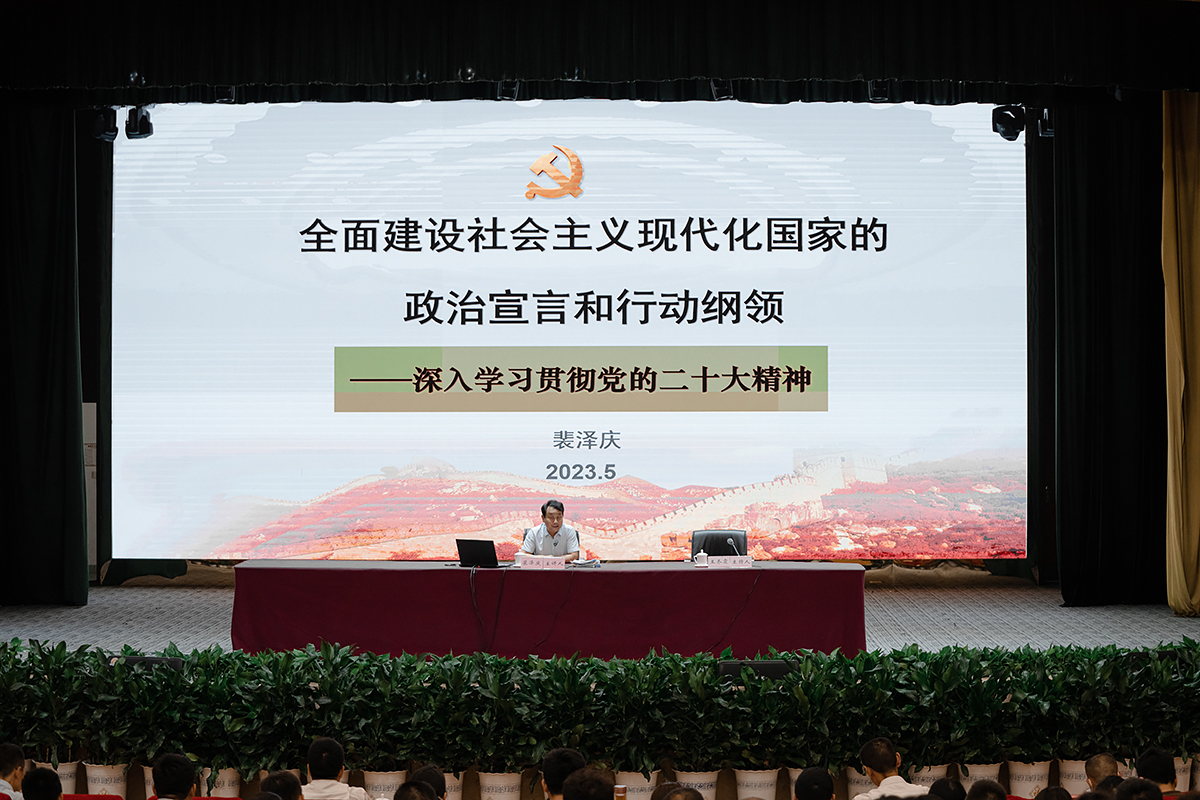 宣讲会上,裴泽庆教授以《全面建设社会主义现代化国家的政治宣言和行动纲领》为题,结合自己的理论研究成果,运用大量史料、数据和案例,从“党的二十大的主题和重大意义”“开辟马克思主义中国化时代化新境界”“以中国式现代化全面推进中华民族伟大复兴”“加强党的全面领导和全面从严治党”等方面对党的二十大精神作了全面系统的解读。报告历时3个小时,主题鲜明、重点突出、论述深刻、精彩生动,既有理论高度又有实践深度,既有宏观视角又有具体分析,为大家进一步精准把握、深刻理解习近平新时代中国特色社会主义思想和党的二十大精神具有很强的指导性和启发性。