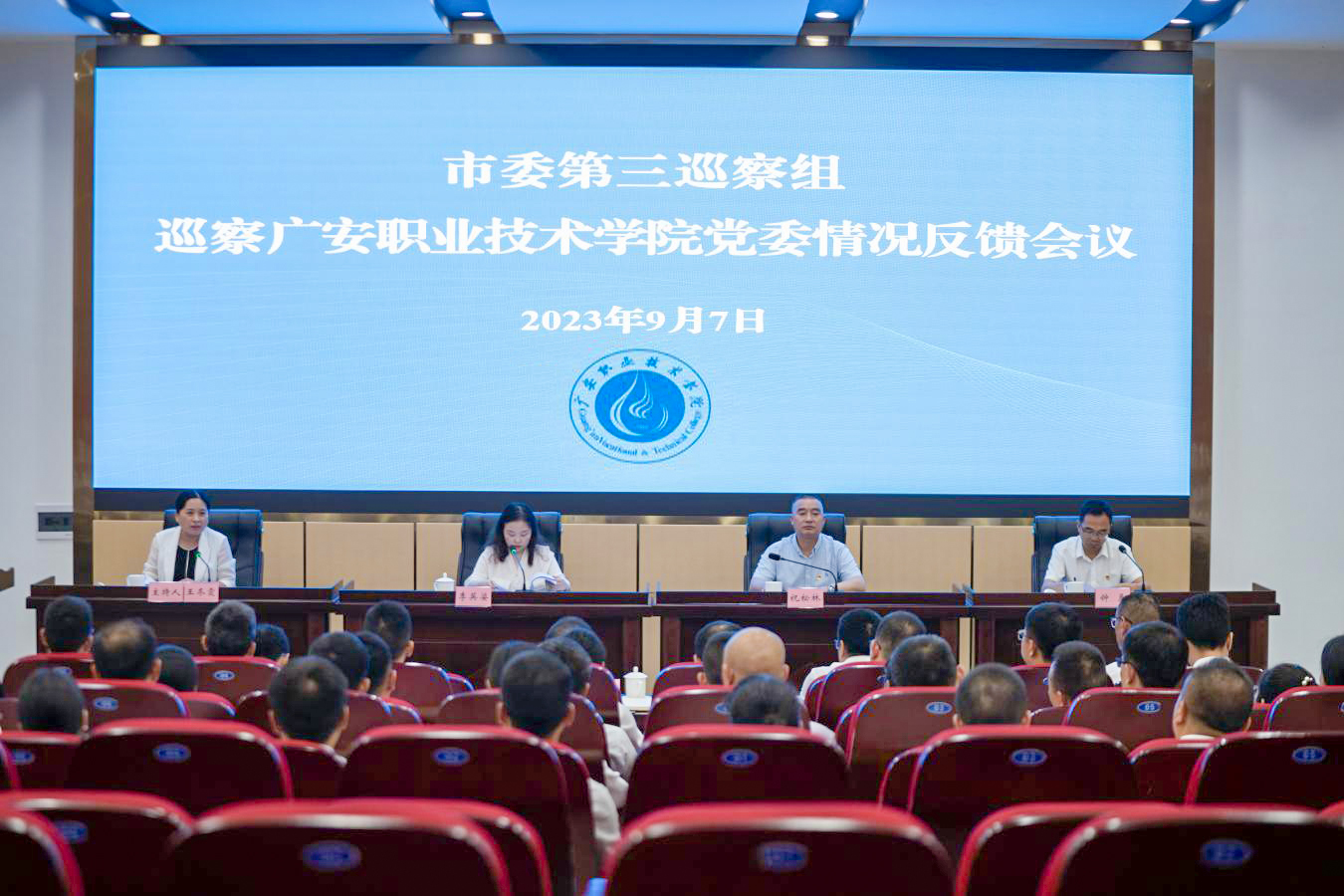 市委第三巡察组副组长钟勇、巡察专员胡倩、市纪委监委第二监察室副主任邹迎春、市委组织部公务员一科陈婷婷,学校党委班子成员及全体中层干部参加会议。