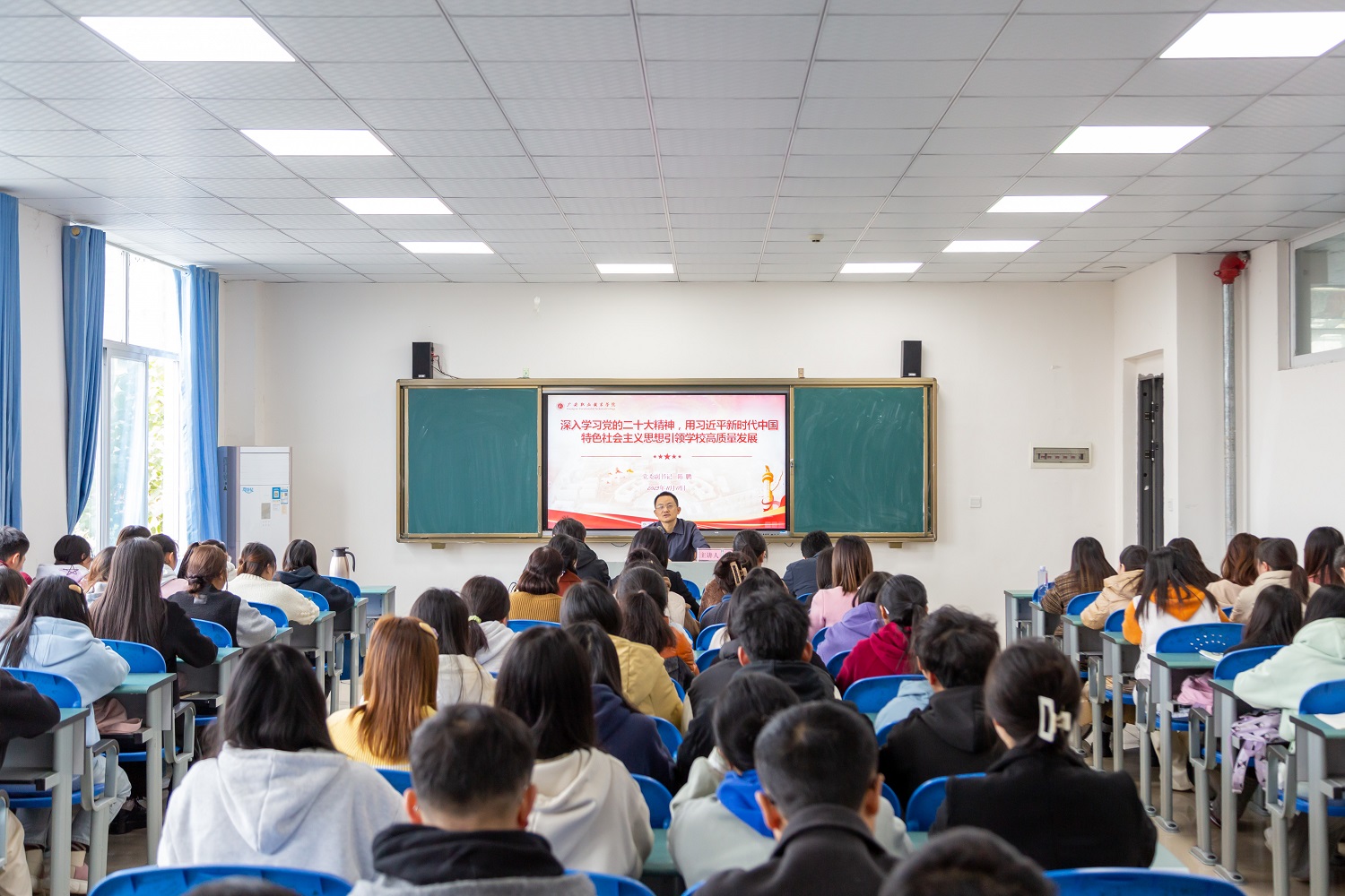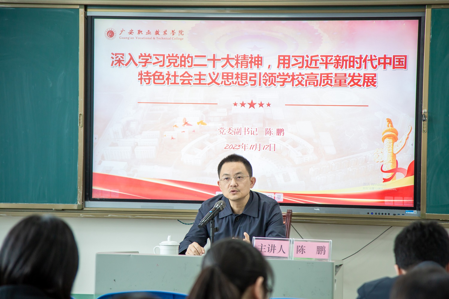 专题党课围绕“深入学习党的二十大精神,用习近平新时代中国特色社会主义思想引领学校高质量发展”展开,陈鹏从四个“牢牢把握”出发,全面解读了党的二十大报告。