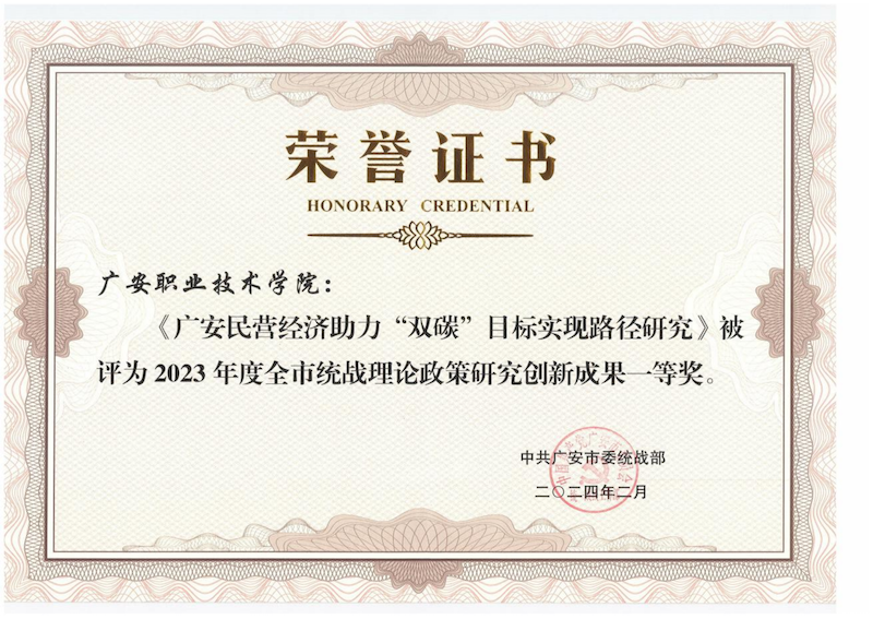 学校统一战线工作坚持以习近平新时代中国特色社会主义思想为指导,深入学习贯彻党的二十大精神和习近平总书记关于做好新时代党的统一战线工作的重要思想,全面贯彻落实党中央、省委和市委关于统战工作的决策部署,按照党中央、省委和市委关于大兴调查研究的部署要求,结合学校教育教学实践,不断总结提炼实践经验。在全校统战理论政策研究工作中,广泛宣传动员,鼓励并精心组织教职工参与统战理论研究,为广安经济社会发展建言献策,组织9个团队申报统战理论政策研究课题。其中,彭勇等人撰写的《广安民营经济助力“双碳”目标实现路径研究》荣获一等奖,李沁逸等人撰写的《新时代背景下网络统一战线研究》荣获二等奖,陈扬等人撰写的《数字经济与统战工作融合发展的路径研究》、郑兴梅等人撰写的《统战工作融入基层党建和社会治理体系研究》荣获三等奖。