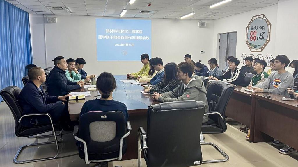 3月26日下午,新材料与化学工程学院召开团学联干部会议暨作风建设会议。学院学生科科长唐梓峻,团总支书记王丰、全体辅导员及团学联主要学生干部参加会议。会议由党总支书记卢德炳主持。