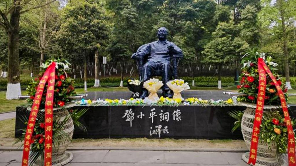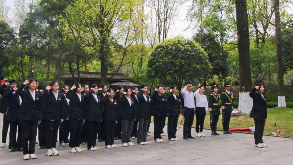 在小平铜像广场,礼兵护送花篮缓缓向前,学员们整队排列,向小平铜像深情鞠躬,寄托崇敬与缅怀之情。随后,学员们重温入团誓词,立志成长为堪当民族大任的新时代小平家乡“种树人”。