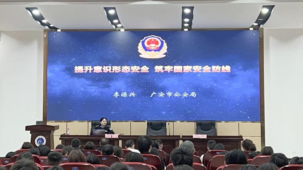 广安市公安局网安支队民警李源兴以《网络安全与大学生意识形态安全》为题与同学们分享了国家安全知识,通过典型案例,深刻剖析国家安全处于的形势和面临的挑战,并对危害国家安全的严重后果进行了阐述,切实提高了青年大学生爱国意识、法纪意识。
